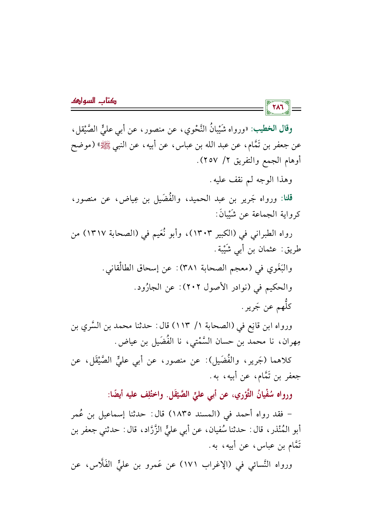 وقال الخطيب: "ورواه شَيْبانُ النَّحْوي، عن منصور، عن أبي عليٍّ الصَّيْقل، عن جعفر بن تَمَّام، عن عبد الله بن عباس، عن أبيه، عن النبي صلى الله عليه وسلم" (موضح أوهام الجمع والتفريق ٢/ ٢٥٧).