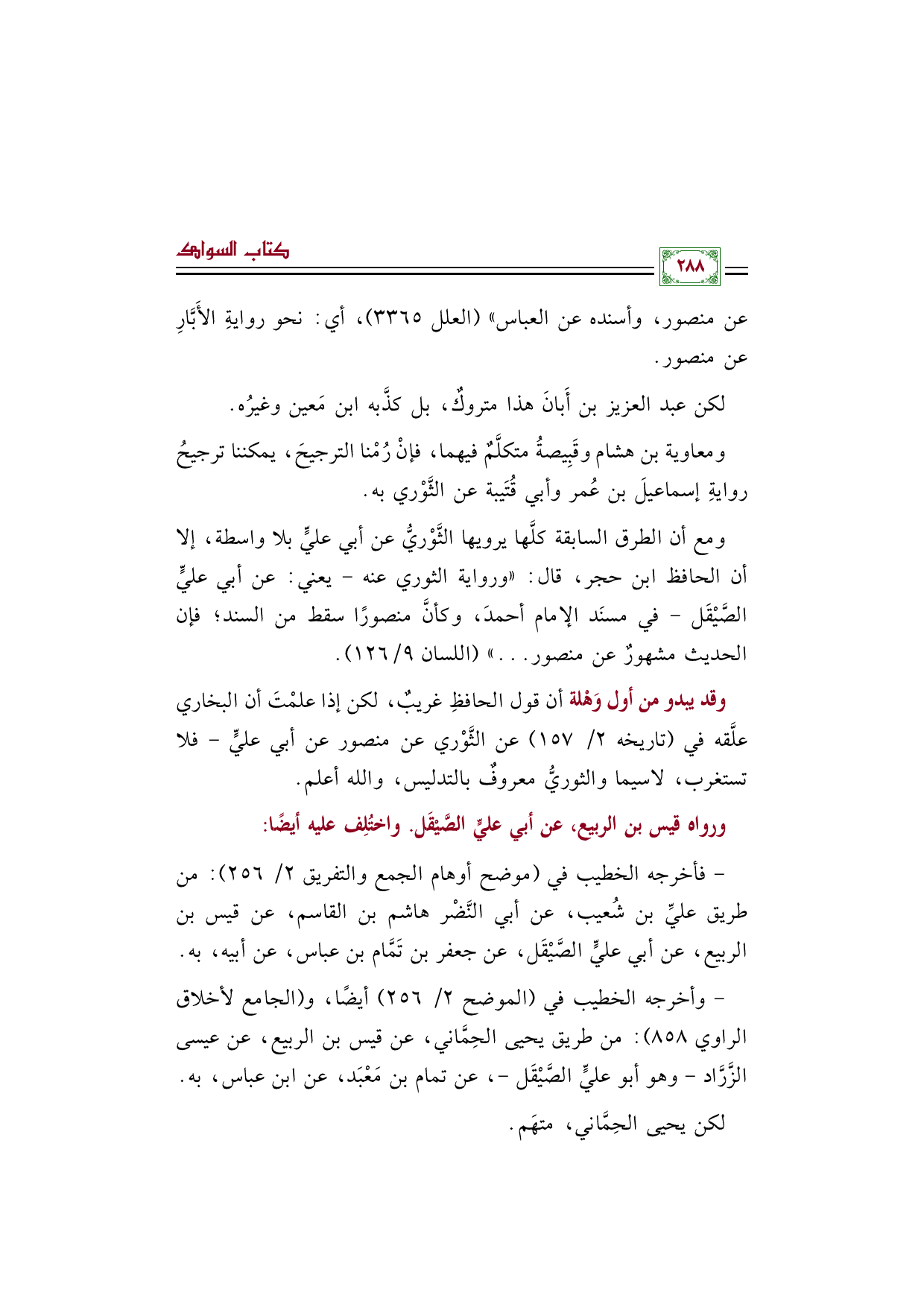 ومع أن الطرق السابقة كلَّها يرويها الثَّوْريُّ عن أبي عليٍّ بلا واسطة، إلا أن الحافظ ابن حجر، قال: "ورواية الثوري عنه - يعني: عن أبي عليٍّ الصَّيْقَل- في مسنَد الإمام أحمدَ، وكأنَّ منصورًا سقط من السند؛ فإن الحديث مشهورٌ عن منصور ... " (اللسان ٩/ ١٢٦).