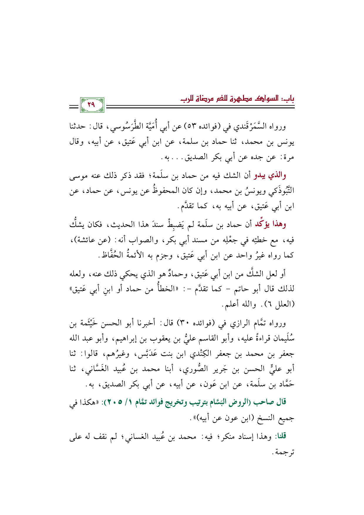 ورواه السَّمَرْقَندي في (فوائده ٥٣) عن أبي أُمَيَّة الطَّرَسُوسي، قال: حدثنا يونس بن محمد، ثنا حماد بن سلمة، عن ابن أبي عَتيق، عن أبيه، وقال مرة: عن جده عن أبي بكر الصديق ... به.
