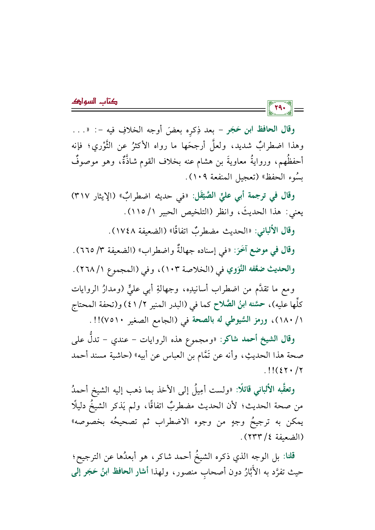 * وقال الحافظ ابن حَجَر- بعد ذِكرِه بعضَ أوجه الخلافِ فيه-: " ... وهذا اضطرابٌ شديد، ولعلَّ أرجحَها ما رواه الأكثرُ عن الثَّوْري؛ فإنه أحفظُهم، وروايةُ معاويةَ بن هشام عنه بخلاف القوم شاذَّةٌ، وهو موصوفٌ بسُوء الحفظ" (تعجيل المنفعة ١٠٩).