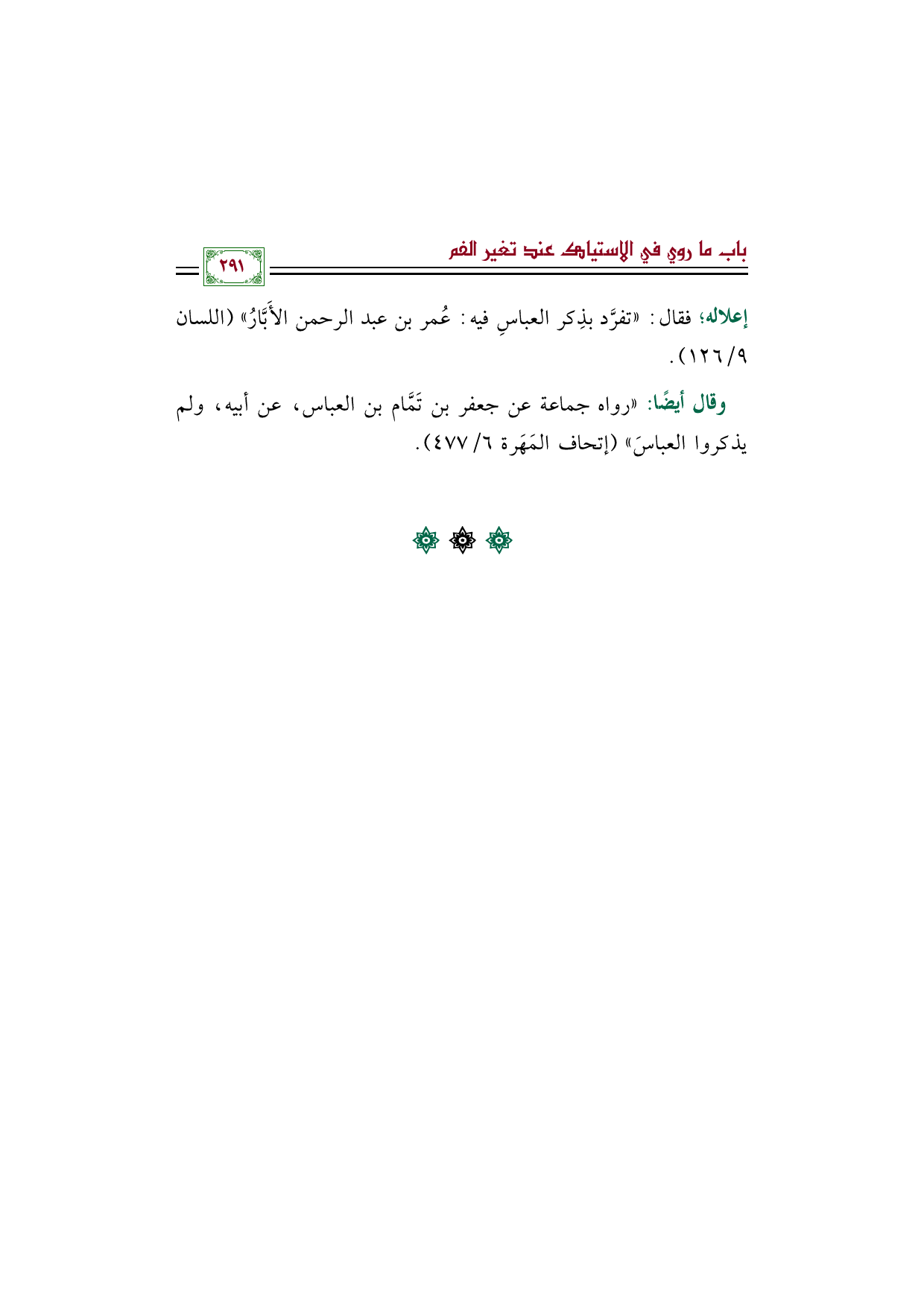 إعلاله؛ فقال: "تفرَّد بذِكر العباسِ فيه: عُمر بن عبد الرحمن الأَبَّارُ" (اللسان ٩/ ١٢٦).