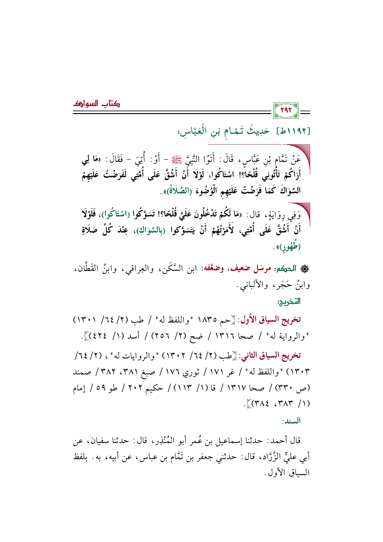 ◼ عَنْ تَمَّامِ بْنِ عَبَّاسٍ، قَالَ: أَتَوُا النَّبِيَّ صَلَّى اللهُ عَلَيْهِ وَسَلَّمَ - أَوْ: أُتِيَ - فَقَالَ: ((مَا لِي أَرَاكُمْ تَأْتُونِي قُلْحًا؟ ! اسْتَاكُوا، لَوْلَا أَنْ أَشُقَّ عَلَى أُمَّتِي لَفَرَضْتُ عَلَيْهِمُ السِّوَاكَ كَمَا فَرَضْتُ عَلَيْهِمِ الْوُضُوءَ (الصَّلَاةُ))).