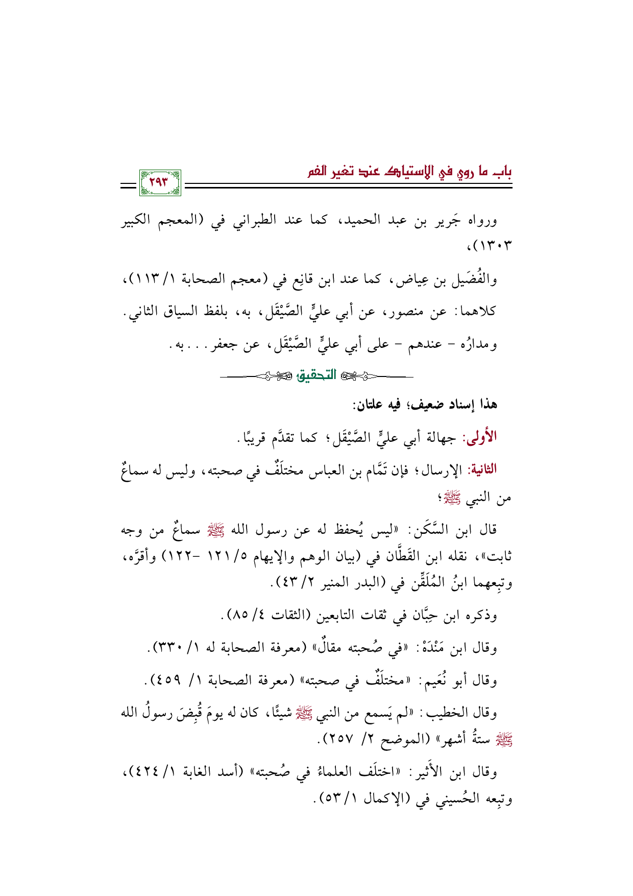 الثانية: الإرسال؛ فإن تَمَّام بن العباس مختلَفٌ في صحبته، وليس له سماعٌ من النبي صلى الله عليه وسلم؛