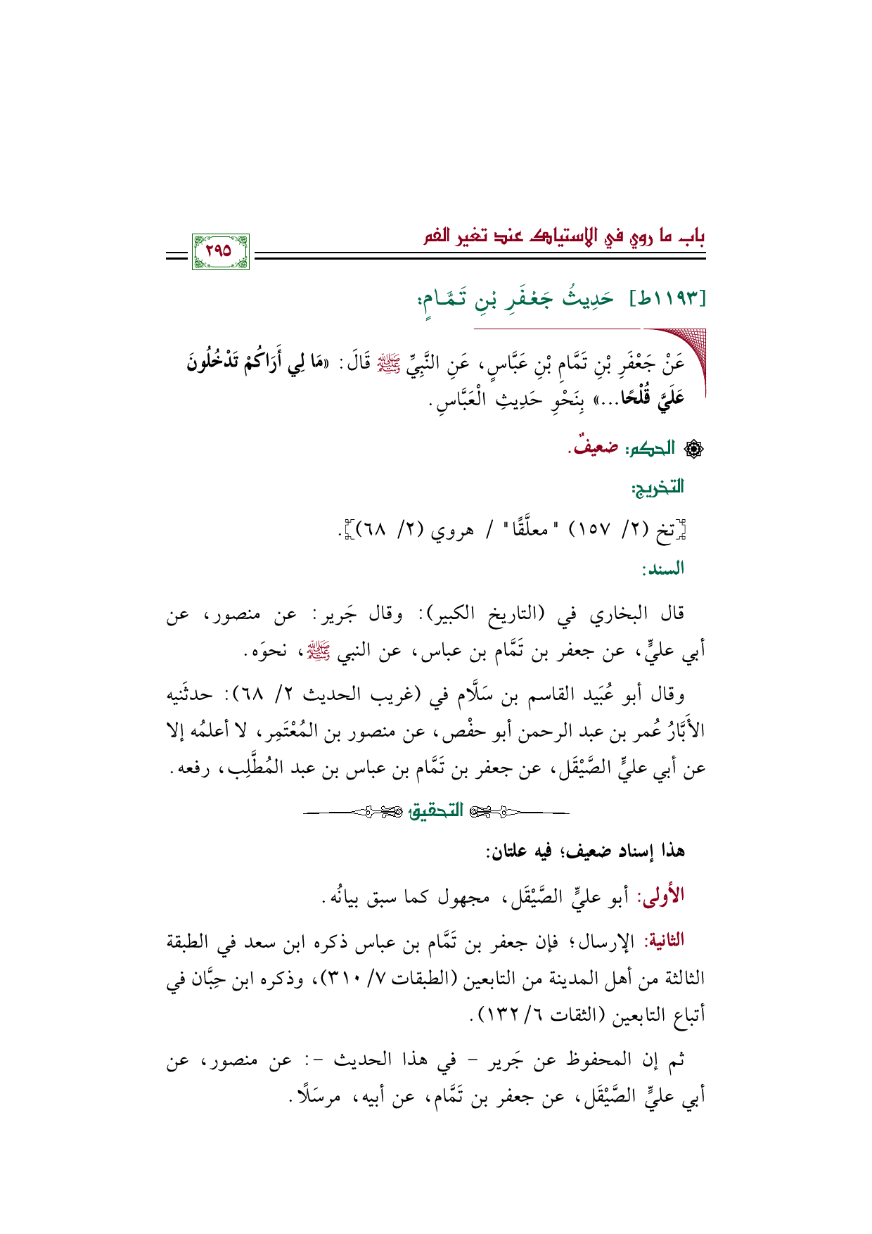 وقال أبو عُبَيد القاسم بن سَلَّام في (غريب الحديث ٢/ ٦٨): حدثَنيه الأَبَّارُ عُمر بن عبد الرحمن أبو حفْص، عن منصور بن المُعْتَمِر، لا أعلمُه إلا عن أبي عليٍّ الصَّيْقَل، عن جعفر بن تَمَّام بن عباس بن عبد المُطَّلِب، رفعه.