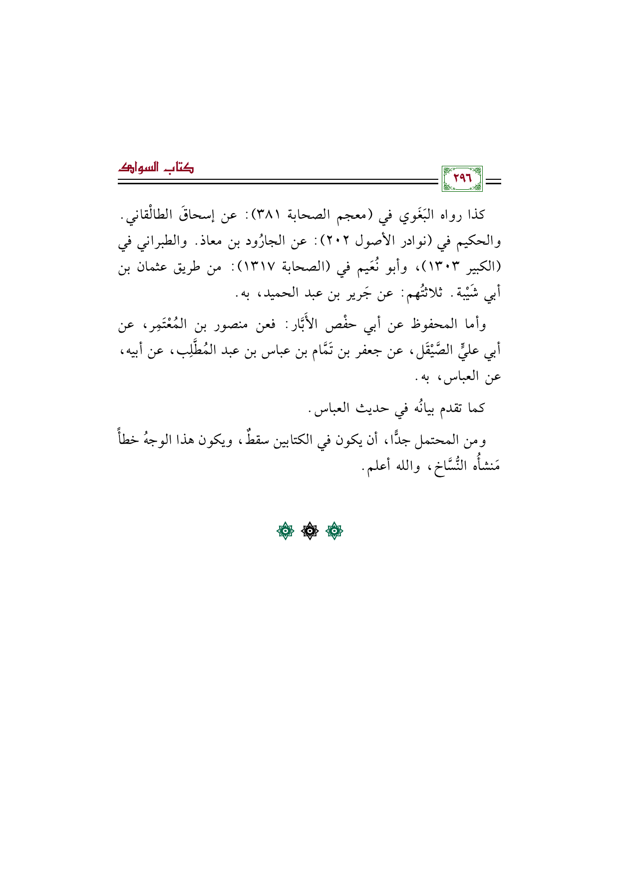 كذا رواه البَغَوي في (معجم الصحابة ٣٨١): عن إسحاقَ الطالْقاني. والحكيم في (نوادر الأصول ٢٠٢): عن الجارُود بن معاذ. والطبراني في (الكبير ١٣٠٣)، وأبو نُعَيم في (الصحابة ١٣١٧): من طريق عثمان بن أبي شَيْبة. ثلاثتُهم: عن جَرير بن عبد الحميد، به.