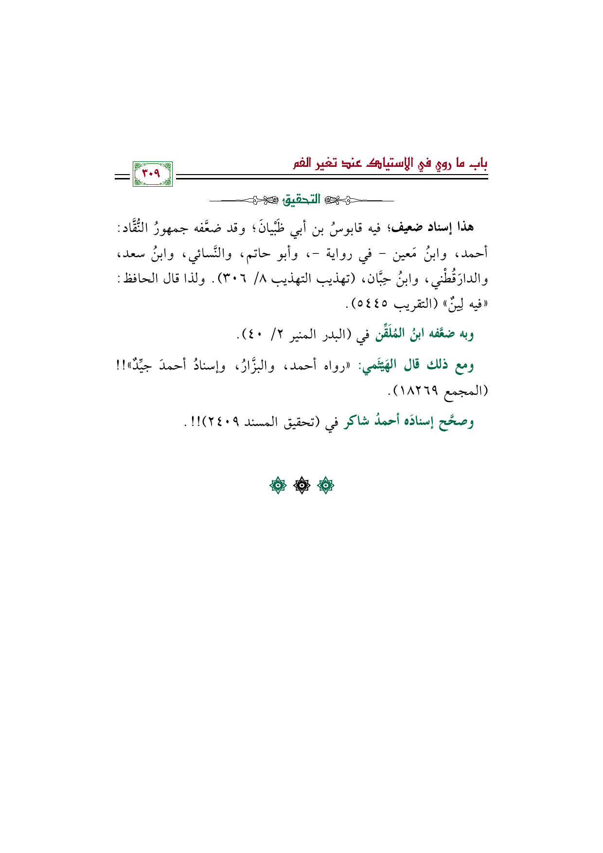 هذا إسناد ضعيف؛ فيه قابوسُ بن أبي ظَبْيانَ؛ وقد ضعَّفه جمهورُ النُّقَّاد: أحمد، وابنُ مَعين- في رواية-، وأبو حاتم، والنَّسائي، وابنُ سعد، والدارَقُطْني، وابنُ حِبَّان، (تهذيب التهذيب ٨/ ٣٠٦). ولذا قال الحافظ: "فيه لِينٌ" (التقريب ٥٤٤٥).