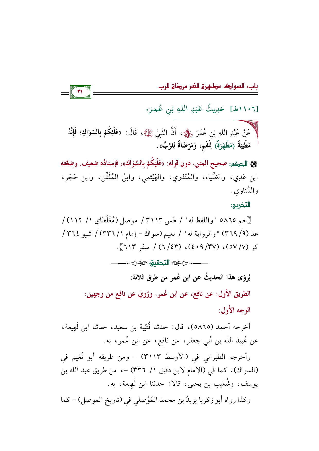 وأخرجه الطبراني في (الأوسط ٣١١٣) - ومن طريقه أبو نُعَيم في "السواك"، كما في (الإمام لابن دقيق ١/ ٣٣٦) -، من طريق عبد الله بن يوسف، وشُعَيب بن يحيى، قالا: حدثنا ابن لَهِيعة، به.