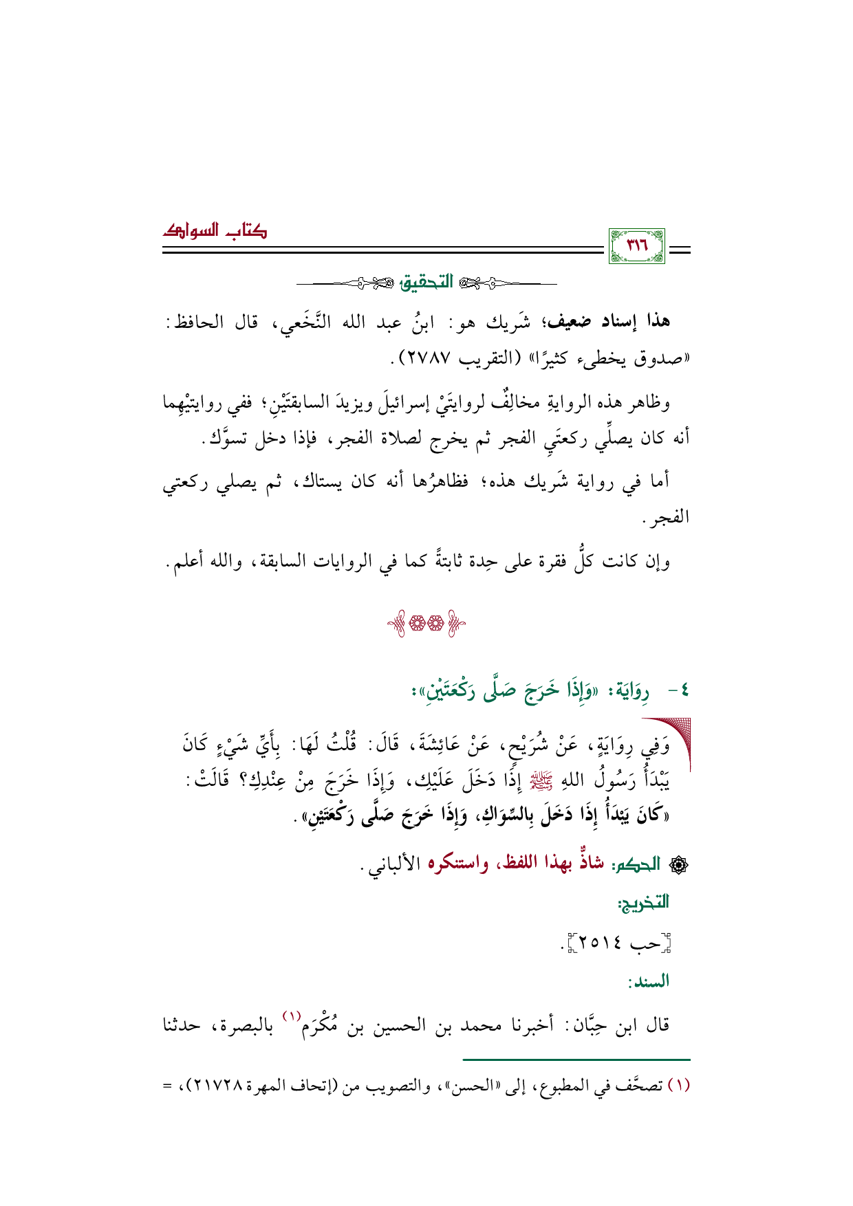 وظاهر هذه الروايةِ مخالِفٌ لروايتَيْ إسرائيلَ ويزيدَ السابقتَيْنِ؛ ففي روايتيْهِما أنه كان يصلِّي ركعتَيِ الفجر ثم يخرج لصلاة الفجر، فإذا دخل تسوَّك.