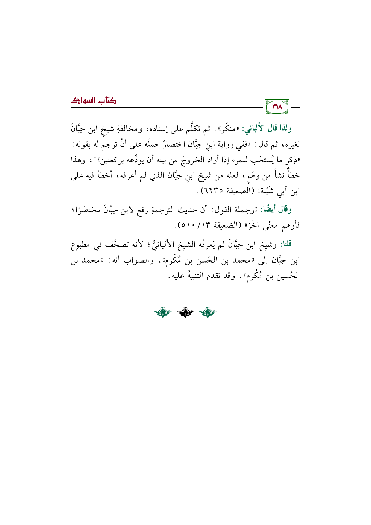 قلنا: وشيخ ابن حِبَّانَ لم يَعرفْه الشيخ الألبانيُّ؛ لأنه تصحَّف في مطبوع ابن حِبَّان إلى "محمد بن الحَسن بن مُكْرم"، والصواب أنه: "محمد بن الحُسين بن مُكْرم". وقد تقدم التنبيهُ عليه.