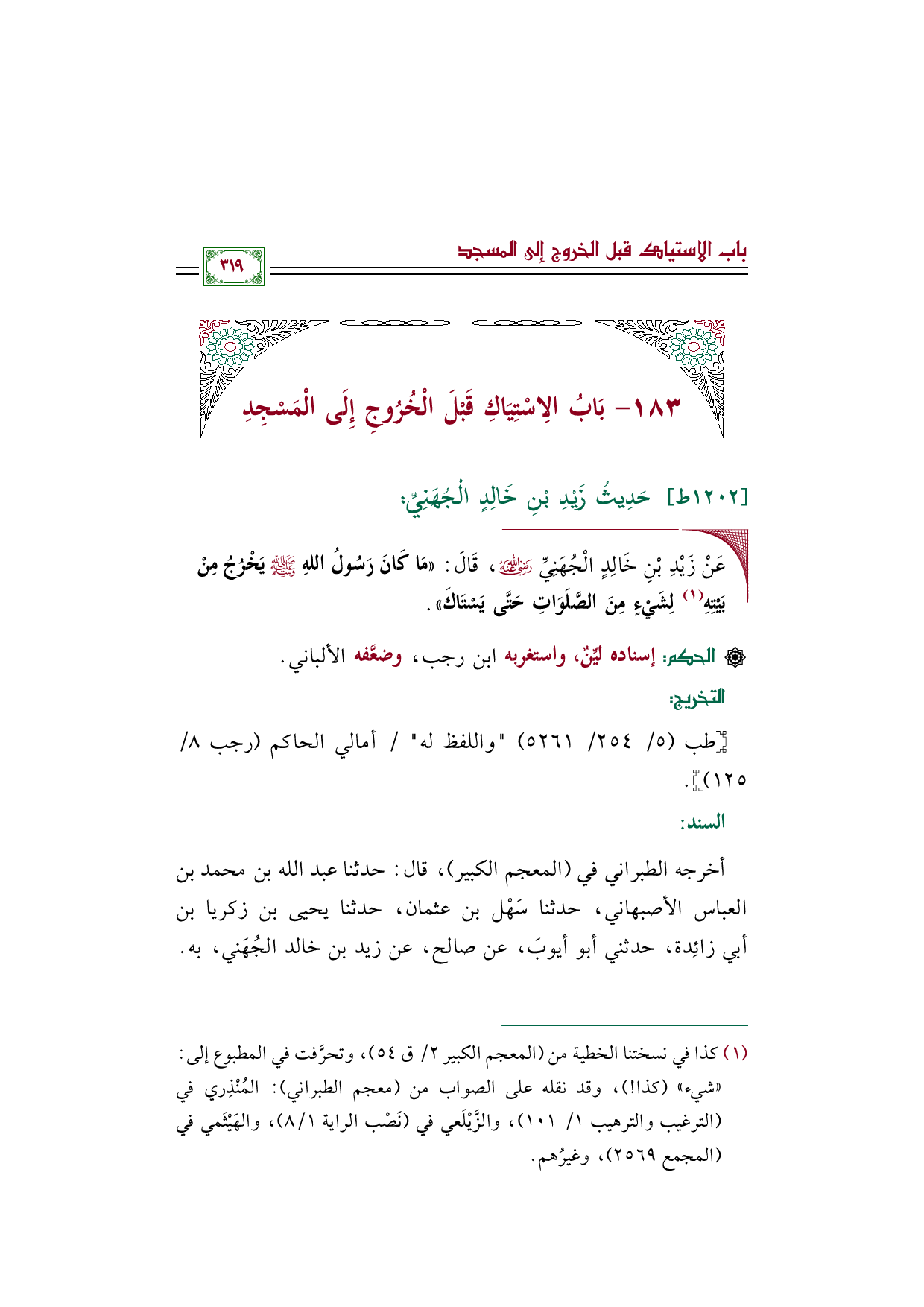 أخرجه الطبراني في (المعجم الكبير)، قال: حدثنا عبد الله بن محمد بن العباس الأصبهاني، حدثنا سَهْل بن عثمان، حدثنا يحيى بن زكريا بن أبي زائِدة، حدثني أبو أيوبَ، عن صالح، عن زيد بن خالد الجُهَني، به.