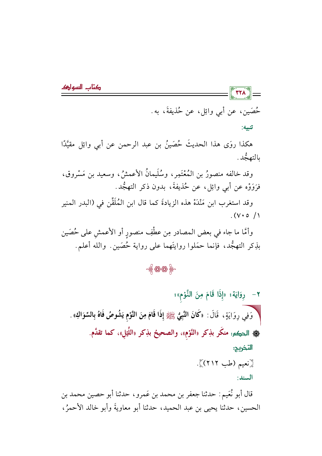 وأمَّا ما جاء في بعض المصادر مِن عطْفِ منصورٍ أو الأعمشِ على حُصَين بذِكر التهجُّد، فإنما حمَلوا روايتَهما على رواية حُصَين. والله أعلم.