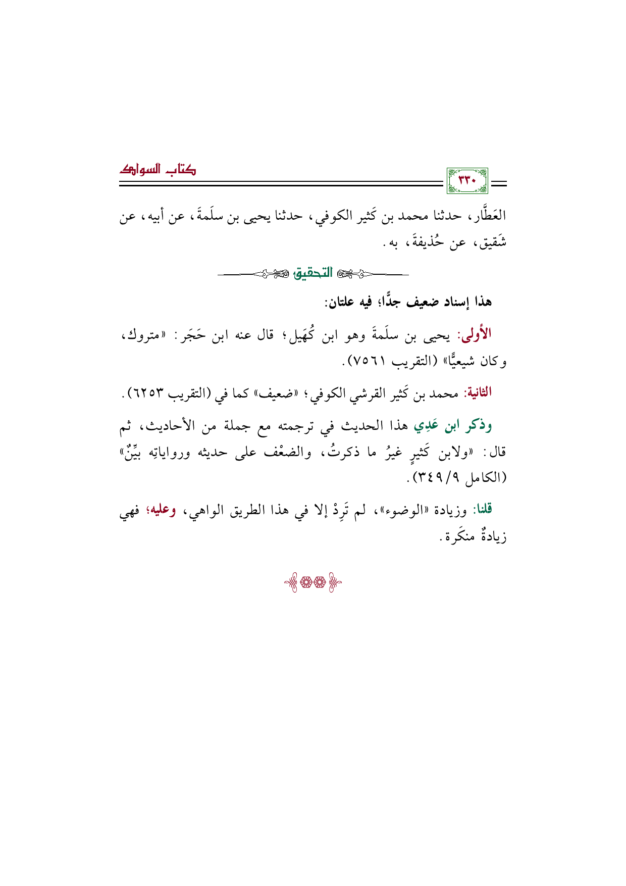 الأولى: يحيى بن سلَمةَ وهو ابن كُهَيل؛ قال عنه ابن حَجَر: "متروك، وكان شيعيًّا" (التقريب ٧٥٦١).