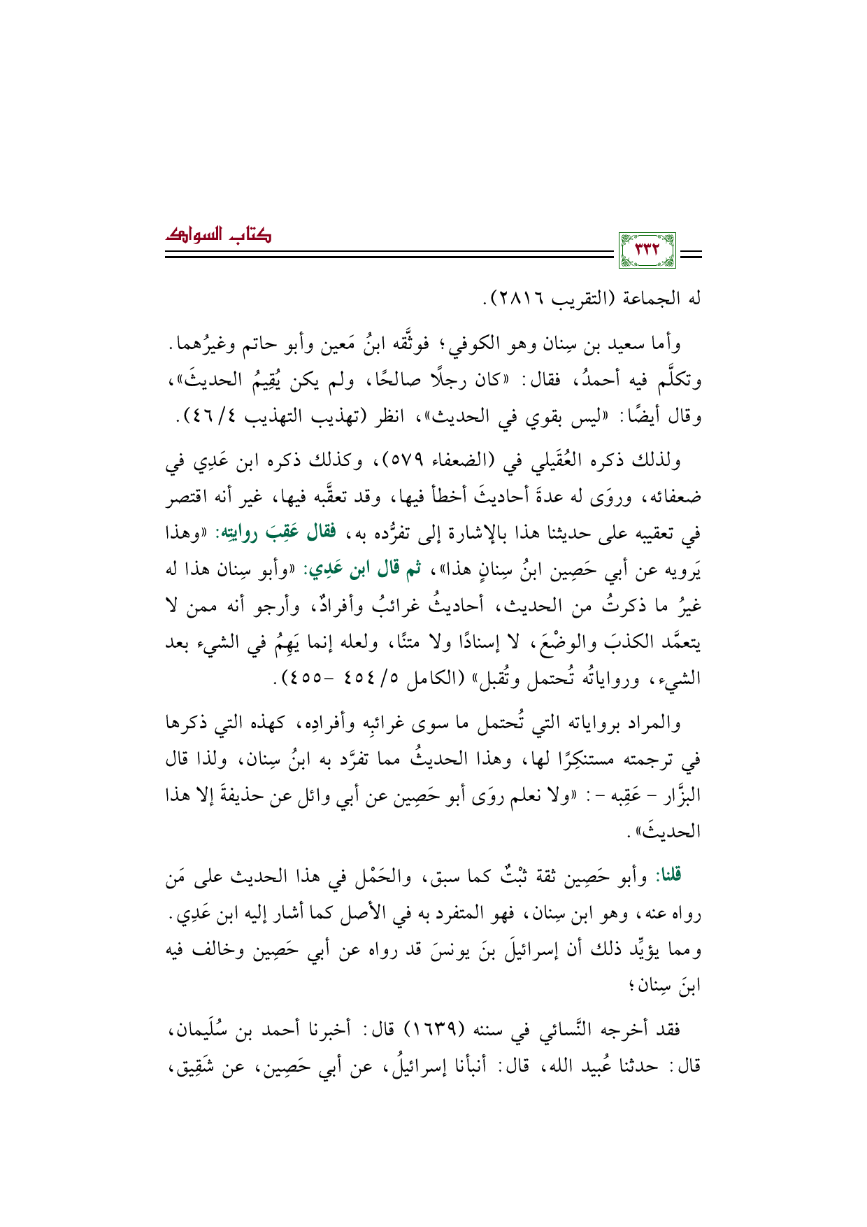 ولذلك ذكره العُقَيلي في (الضعفاء ٥٧٩)، وكذلك ذكره ابن عَدِي في ضعفائه، وروَى له عدةَ أحاديثَ أخطأ فيها، وقد تعقَّبه فيها، غير أنه اقتصر في تعقيبه على حديثنا هذا بالإشارة إلى تفرُّده به، فقال عَقِبَ روايتِه: "وهذا يَرويه عن أبي حَصِين ابنُ سِنانٍ هذا"، ثم قال ابن عَدِي: "وأبو سِنان هذا له غيرُ ما ذكرتُ من الحديث، أحاديثُ غرائبُ وأفرادٌ، وأرجو أنه ممن لا يتعمَّد الكذبَ والوضْعَ، لا إسنادًا ولا متنًا، ولعله إنما يَهِمُ في الشيء بعد الشيء، ورواياتُه تُحتمل وتُقبل" (الكامل ٥/ ٤٥٤ - ٤٥٥).