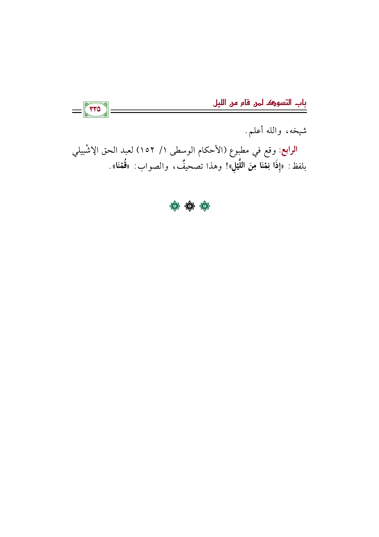 الرابع: وقع في مطبوع (الأحكام الوسطى ١/ ١٥٢) لعبد الحق الإشْبيلي بلفظ: ((إِذَا نِمْنَا مِنَ اللَّيْلِ))! وهذا تصحيفٌ، والصواب: ((قُمْنَا)).