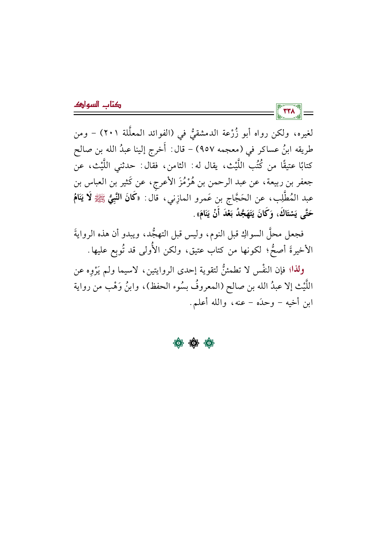 لغيره، ولكن رواه أبو زُرْعة الدمشقيُّ في (الفوائد المعلَّلة ٢٠١) - ومن طريقه ابنُ عساكر في (معجمه ٩٥٧) - قال: أَخرج إلينا عبدُ الله بن صالح كتابًا عتيقًا من كُتُب اللَّيْث، يقال له: الثامن، فقال: حدثني اللَّيْث، عن جعفر بن ربيعة، عن عبد الرحمن بن هُرْمُزَ الأعرجِ، عن كَثير بن العباس بن عبد المُطَّلِب، عن الحَجَّاج بن عَمرو المازِني، قال: ((كَانَ النَّبِيُّ صَلَّى اللهُ عَلَيْهِ وَسَلَّمَ لَا يَنَامُ حَتَّى يَسْتَاكَ، وَكَانَ يَتَهَجَّدُ بَعْدَ أَنْ يَنَامَ)).