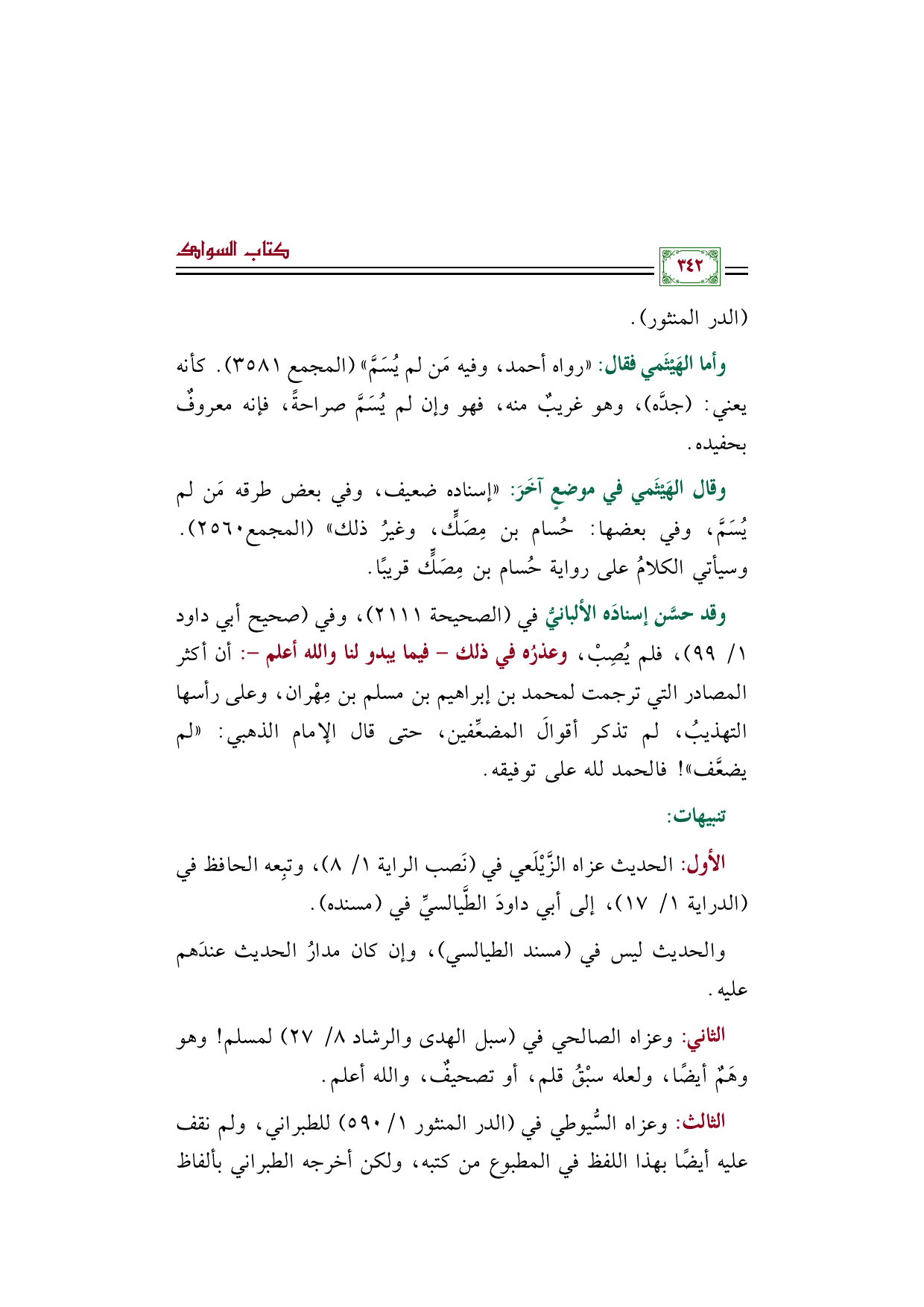 وقد حسَّن إسنادَه الألبانيُّ في (الصحيحة ٢١١١)، وفي (صحيح أبي داود ١/ ٩٩)، فلم يُصِبْ، وعذرُه في ذلك- فيما يبدو لنا والله أعلم-: أن أكثر المصادر التي ترجمت لمحمد بن إبراهيم بن مسلم بن مِهْران، وعلى رأسها التهذيبُ، لم تذكر أقوالَ المضعِّفين، حتى قال الإمام الذهبي: "لم يضعَّف"! فالحمد لله على توفيقه.