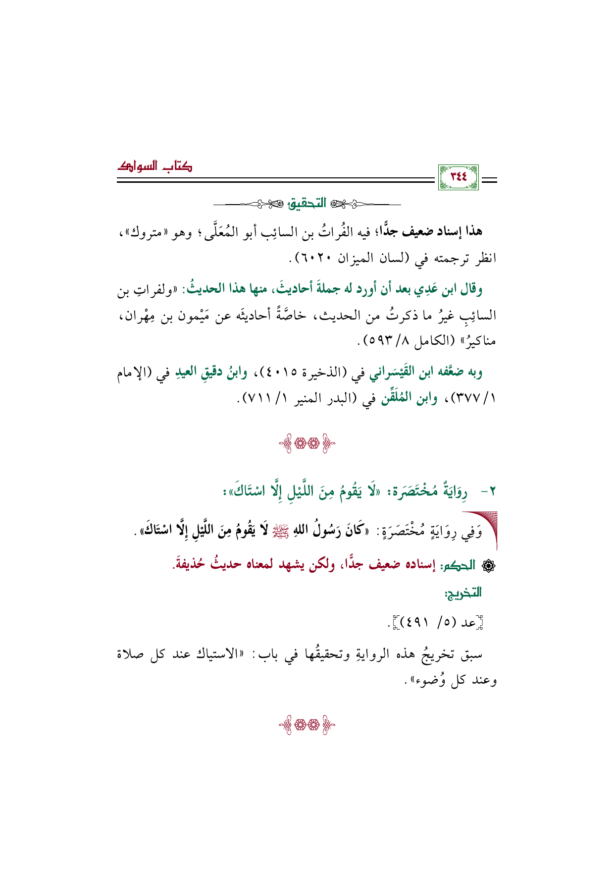 • وَفِي رِوَايَةٍ مُخْتَصَرَةٍ: ((كَانَ رَسُولُ اللهِ صَلَّى اللهُ عَلَيْهِ وَسَلَّمَ لَا يَقُومُ مِنَ اللَّيْلِ إِلَّا اسْتَاكَ)).