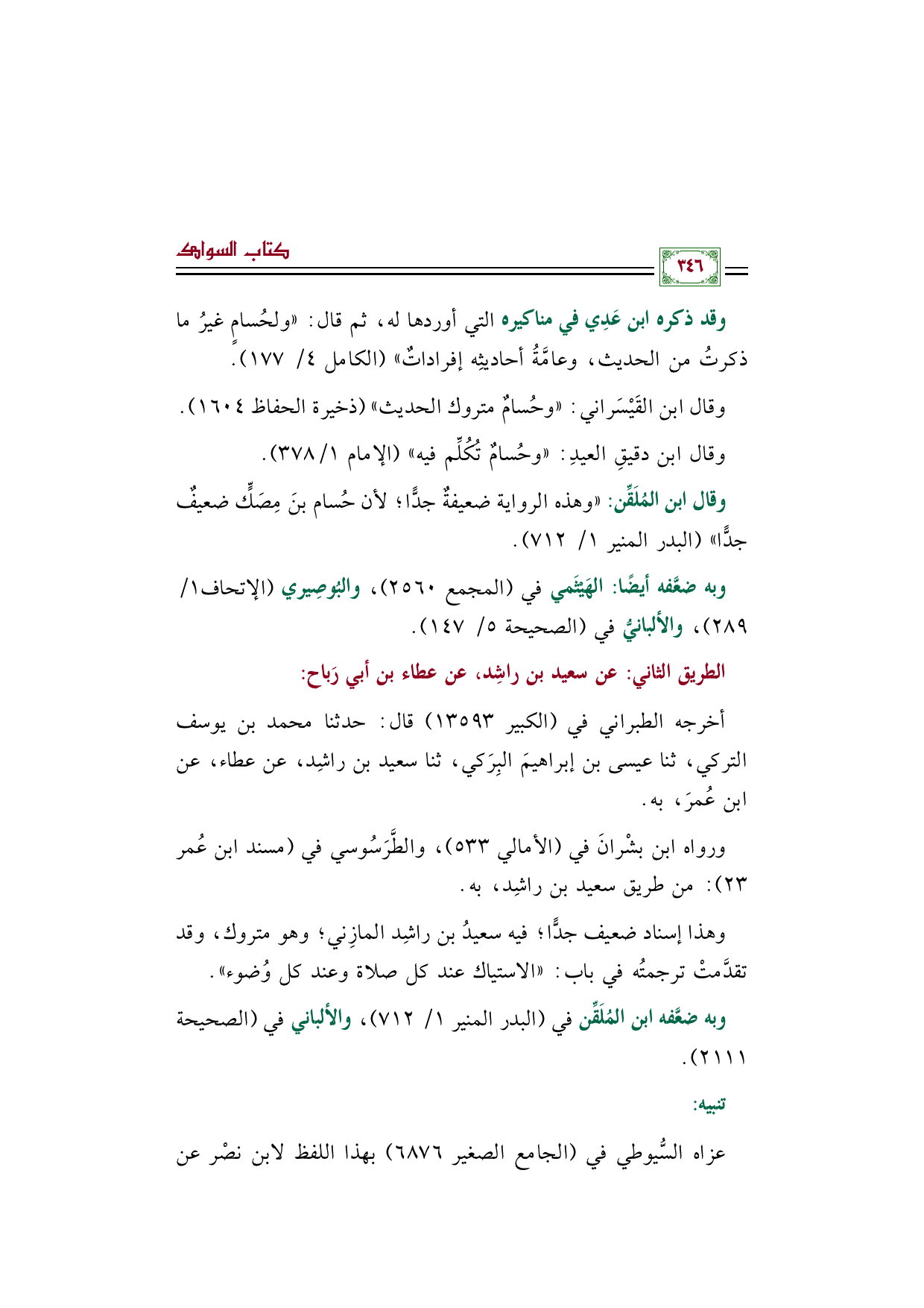 وقال ابن المُلَقِّن: "وهذه الرواية ضعيفةٌ جدًّا؛ لأن حُسام بنَ مِصَكٍّ ضعيفٌ جدًّا" (البدر المنير ١/ ٧١٢).