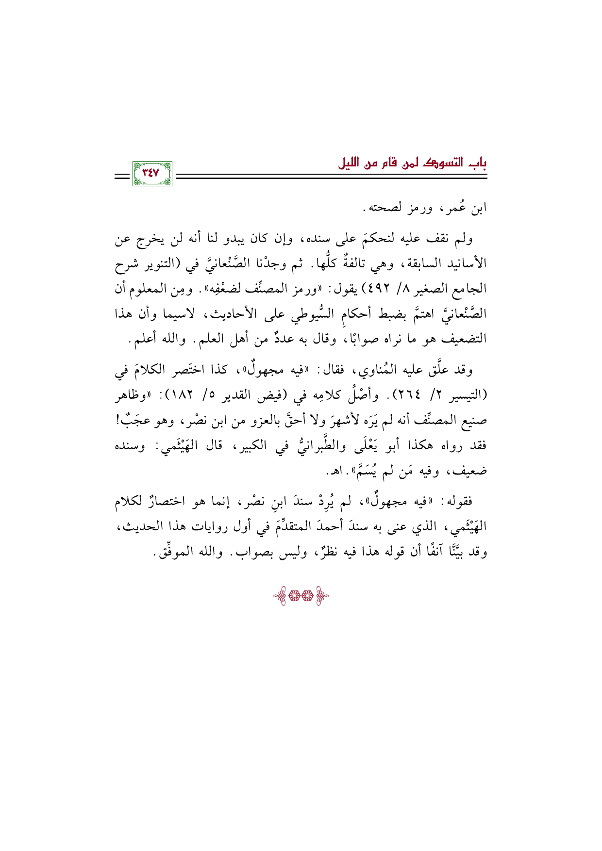 فقوله: "فيه مجهولٌ"، لم يُرِدْ سندَ ابنِ نصْر، إنما هو اختصارٌ لكلام الهَيْثَمي، الذي عنى به سندَ أحمدَ المتقدِّمَ في أول روايات هذا الحديث، وقد بيَّنَّا آنفًا أن قوله هذا فيه نظرٌ، وليس بصواب. والله الموفِّق.