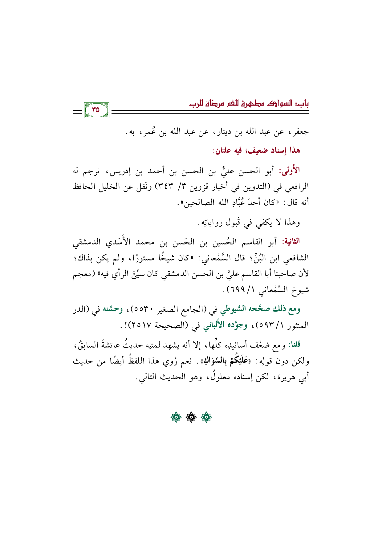 قلنا: ومع ضعْف أسانيدِه كلِّها، إلا أنه يشهد لمتنِه حديثُ عائشةَ السابقُ، ولكن دون قولِه: ((عَلَيْكُمْ بِالسِّوَاكِ)). نعم رُوي هذا اللفظُ أيضًا من حديث أبي هريرة، لكن إسناده معلولٌ، وهو الحديث التالي.