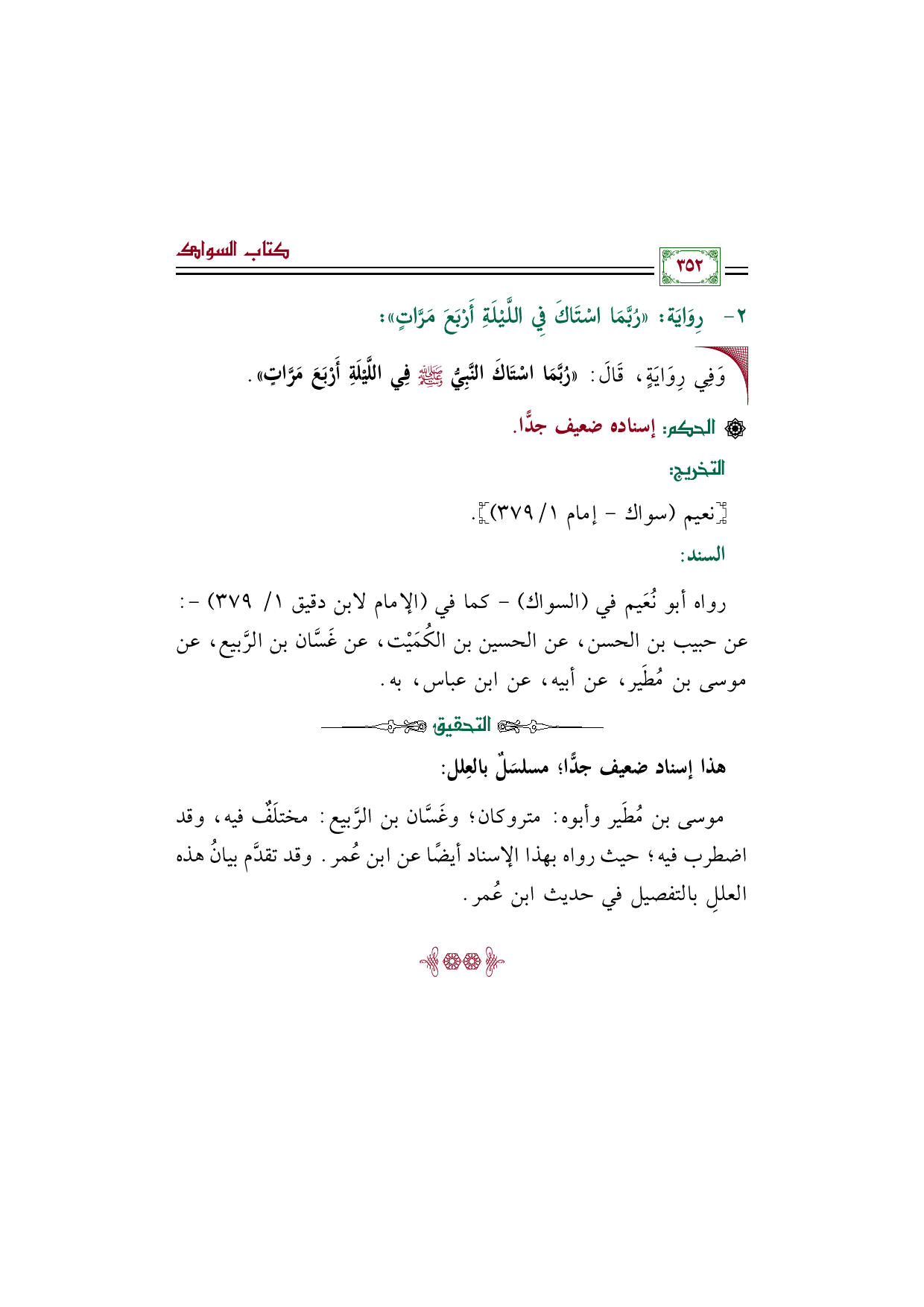 رواه أبو نُعَيم في "السواك"- كما في (الإمام لابن دقيق ١/ ٣٧٩) -: عن حبيب بن الحسن، عن الحسين بن الكُمَيْت، عن غَسَّان بن الرَّبيع، عن موسى بن مُطَير، عن أبيه، عن ابن عباس، به.
