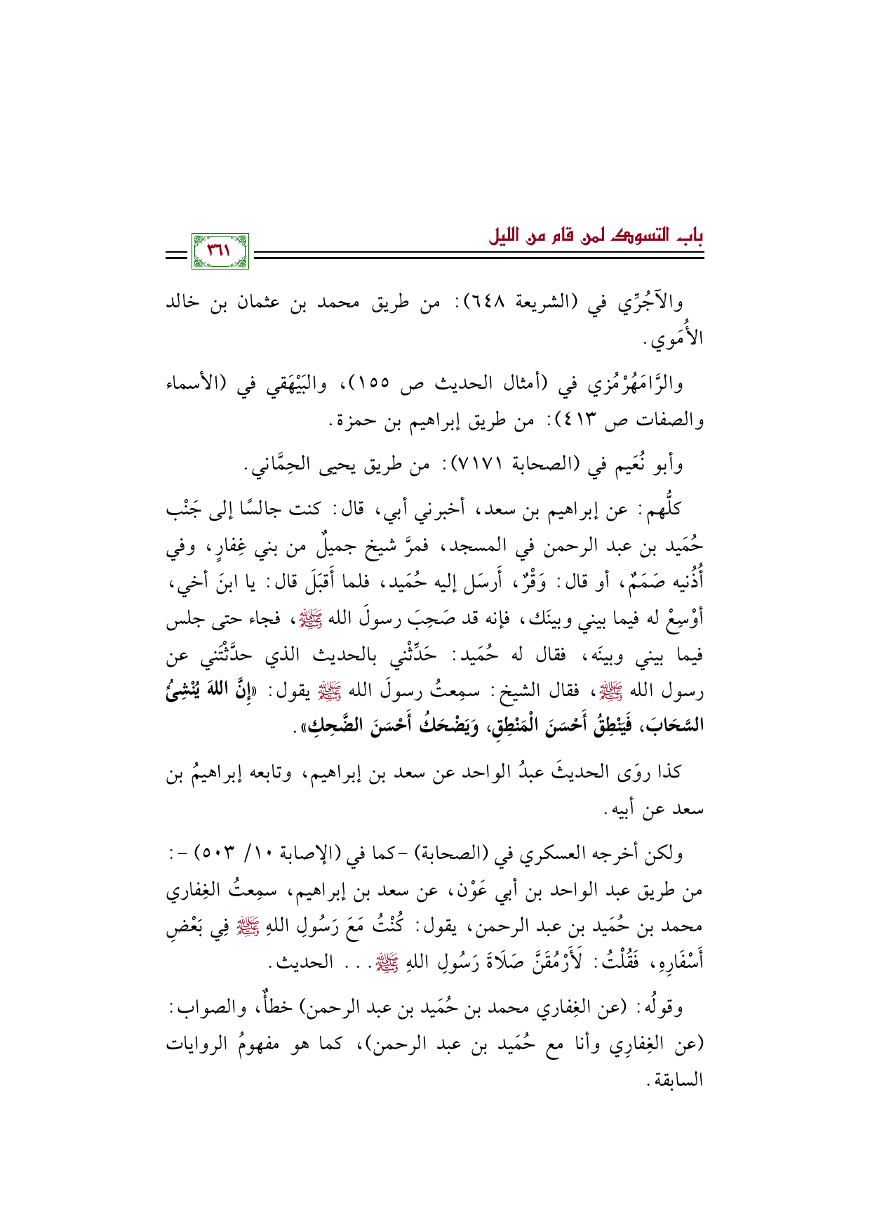 وقولُه: (عن الغِفاري محمد بن حُمَيد بن عبد الرحمن) خطأٌ، والصواب: (عن الغِفارِي وأنا مع حُمَيد بن عبد الرحمن)، كما هو مفهومُ الروايات السابقة.