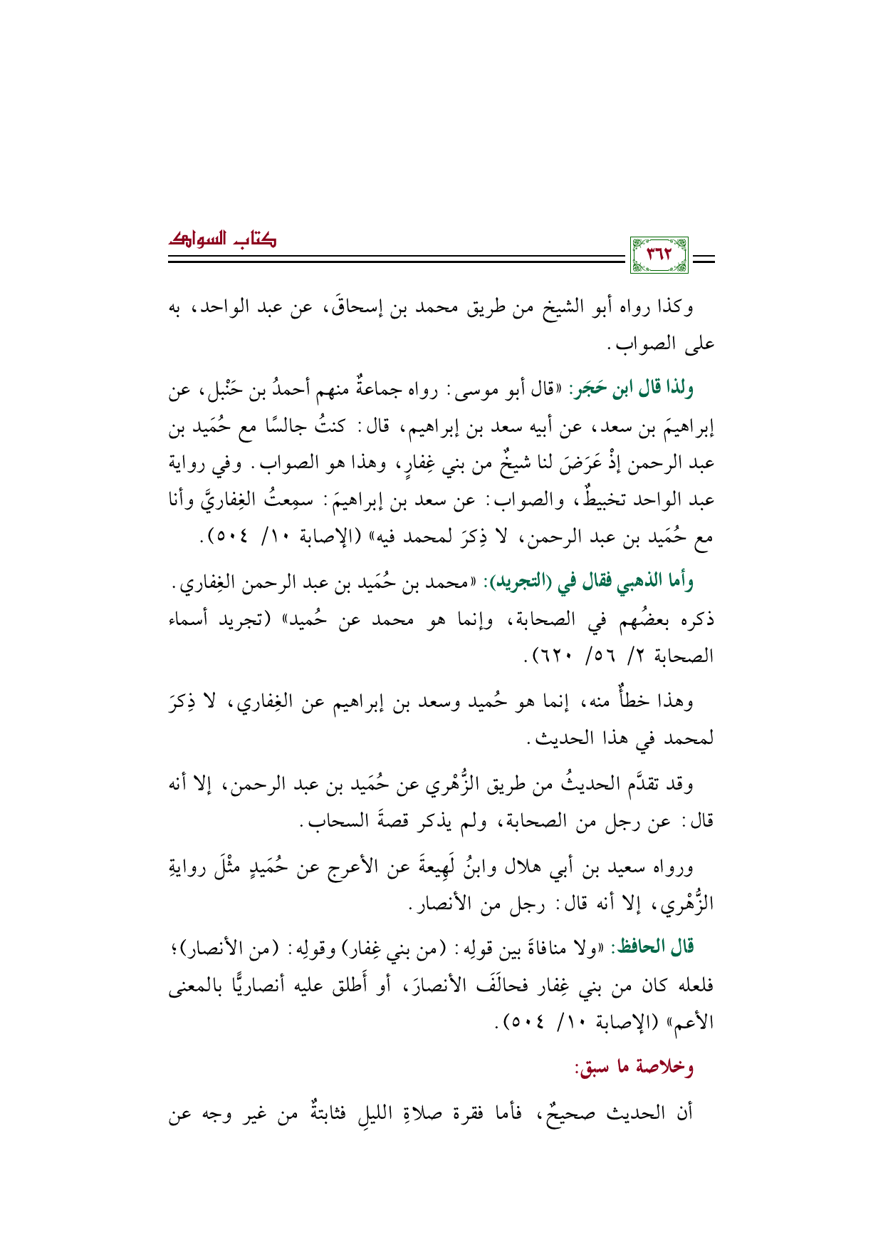 ولذا قال ابن حَجَر: "قال أبو موسى: رواه جماعةٌ منهم أحمدُ بن حَنْبل، عن إبراهيمَ بن سعد، عن أبيه سعد بن إبراهيم، قال: كنتُ جالسًا مع حُمَيد بن عبد الرحمن إذْ عَرَضَ لنا شيخٌ من بني غِفارٍ، وهذا هو الصواب. وفي رواية عبد الواحد تخبيطٌ، والصواب: عن سعد بن إبراهيمَ: سمِعتُ الغِفاريَّ وأنا مع حُمَيد بن عبد الرحمن، لا ذِكرَ لمحمد فيه" (الإصابة ١٠/ ٥٠٤).