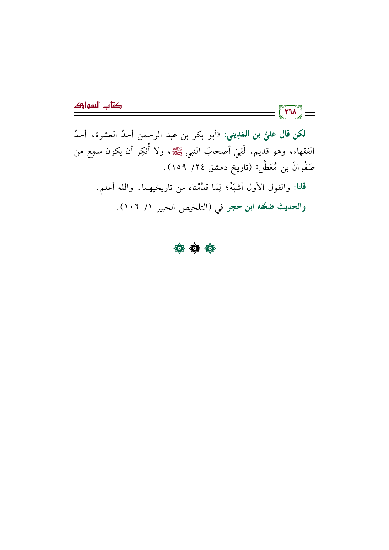 لكن قال عليُّ بن المَدِيني: "أبو بكر بن عبد الرحمن أحدُ العشرة، أحدُ الفقهاء، وهو قديم، لَقِيَ أصحابَ النبي صلى الله عليه وسلم، ولا أُنكِر أن يكون سمِع من صَفْوانَ بن مُعَطَّل" (تاريخ دمشق ٢٤/ ١٥٩).