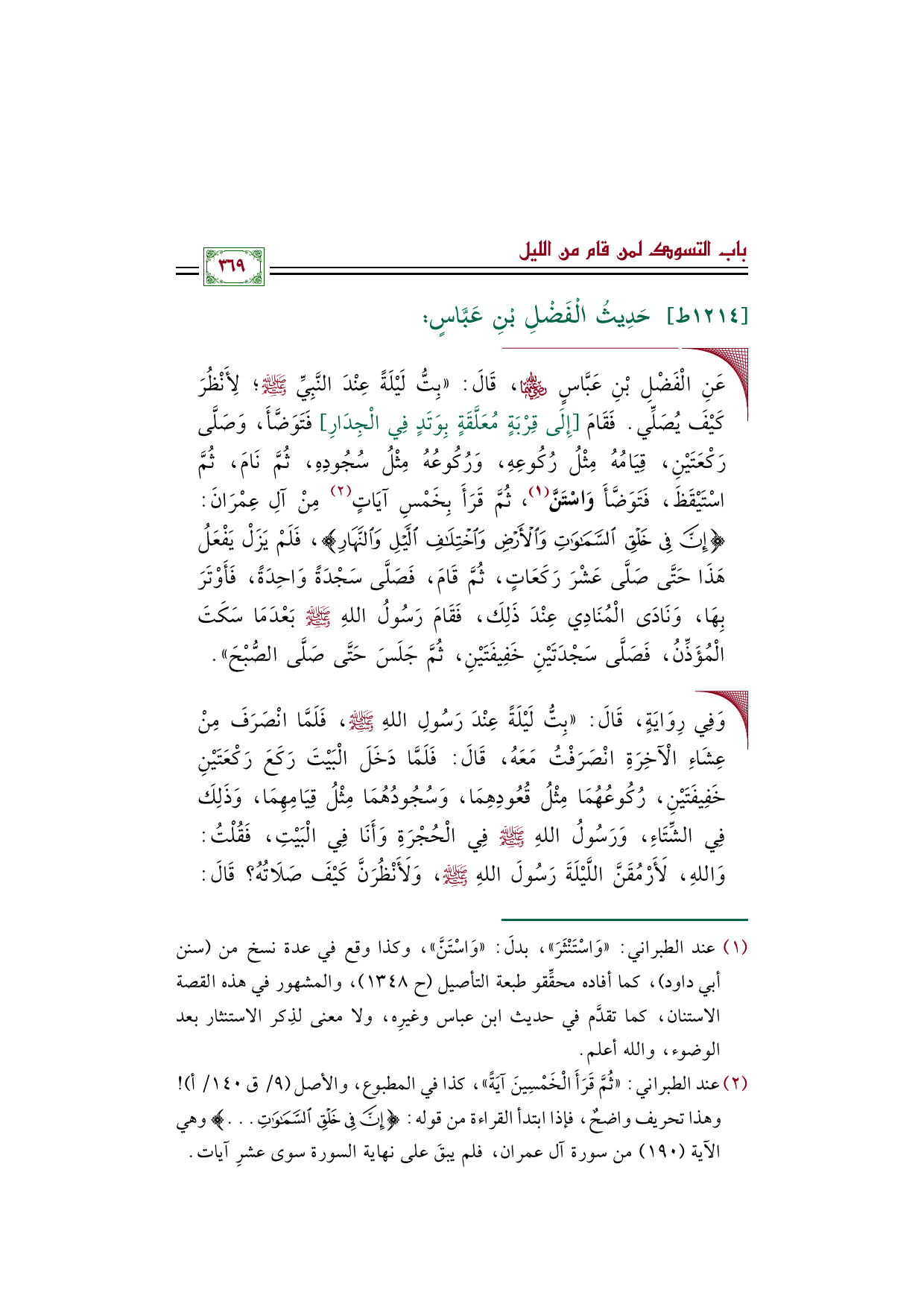 ◼ عَنِ الْفَضْلِ بْنِ عَبَّاسٍ رَضِيَ اللهُ عَنْهُمَا، قَالَ: ((بِتُّ لَيْلَةً عِنْدَ النَّبِيِّ صَلَّى اللهُ عَلَيْهِ وَسَلَّمَ؛ لِأَنْظُرَ كَيْفَ يُصَلِّي. فَقَامَ [إِلَى قِرْبَةٍ مُعَلَّقَةٍ بِوَتَدٍ فِي الْجِدَارِ] فَتَوَضَّأَ، وَصَلَّى رَكْعَتَيْنِ، قِيَامُهُ مِثْلُ رُكُوعِهِ، وَرُكُوعُهُ مِثْلُ سُجُودِهِ، ثُمَّ نَامَ، ثُمَّ اسْتَيْقَظَ، فَتَوَضَّأَ وَاسْتَنَّ (¬١)، ثُمَّ قَرَأَ بِخَمْسِ آيَاتٍ (¬٢) مِنْ آلِ عِمْرَانَ: {إِنَّ فِي خَلْقِ السَّمَوَاتِ وَالْأَرْضِ وَاخْتِلَافِ اللَّيْلِ وَالنَّهَارِ}، فَلَمْ يَزَلْ يَفْعَلُ هَذَا حَتَّى صَلَّى عَشْرَ رَكَعَاتٍ، ثُمَّ قَامَ، فَصَلَّى سَجْدَةً وَاحِدَةً، فَأَوْتَرَ بِهَا، وَنَادَى الْمُنَادِي عِنْدَ ذَلِكَ، فَقَامَ رَسُولُ اللهِ صَلَّى اللهُ عَلَيْهِ وَسَلَّمَ بَعْدَمَا سَكَتَ الْمُؤَذِّنُ، فَصَلَّى سَجْدَتَيْنِ خَفِيفَتَيْنِ، ثُمَّ جَلَسَ حَتَّى صَلَّى الصُّبْحَ)).