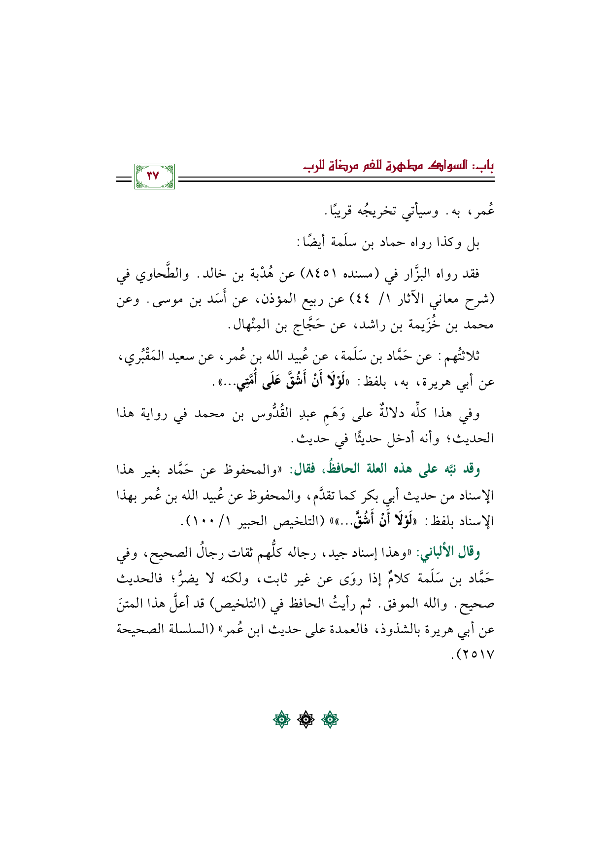 ثلاثتُهم: عن حَمَّاد بن سَلَمة، عن عُبيد الله بن عُمر، عن سعيد المَقْبُري، عن أبي هريرة، به، بلفظ: ((لَوْلَا أَنْ أَشُقَّ عَلَى أُمَّتِي ... )).