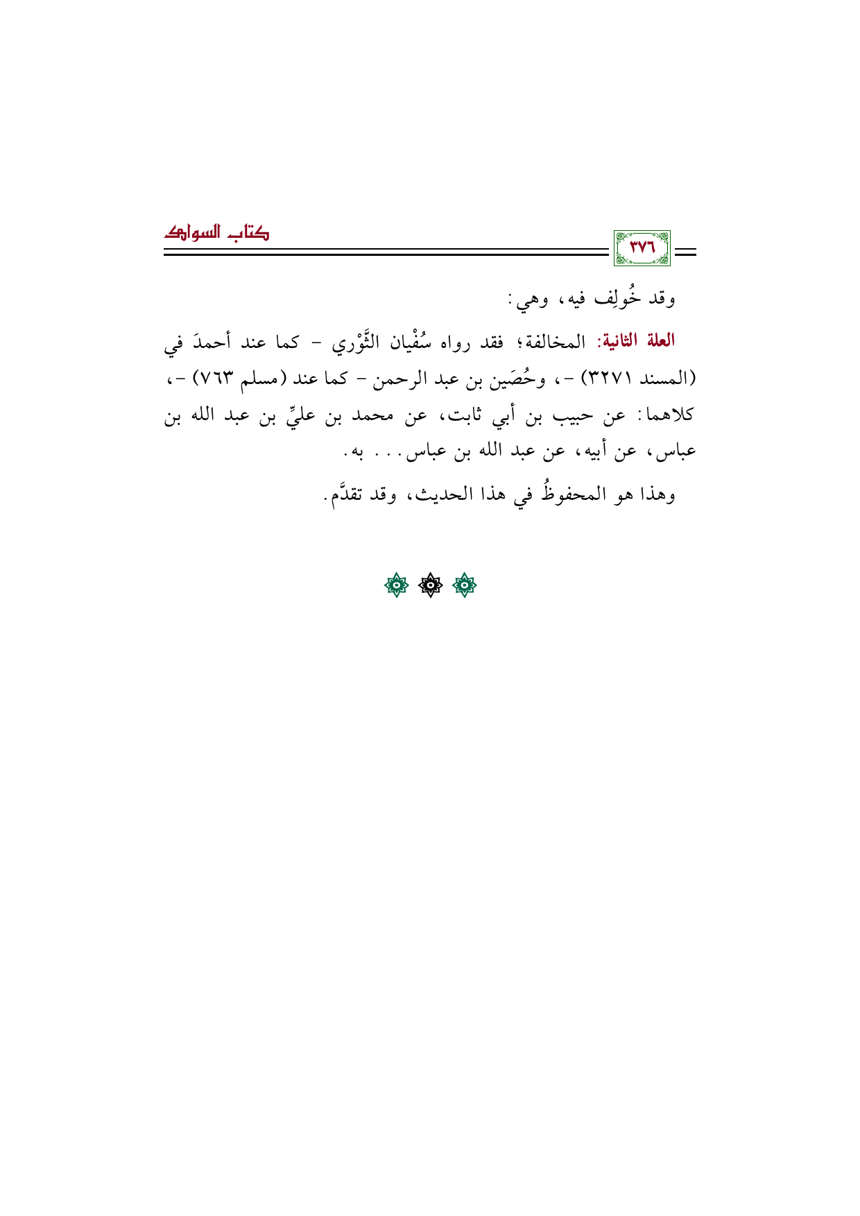 العلة الثانية: المخالفة؛ فقد رواه سُفْيان الثَّوْري- كما عند أحمدَ في (المسند ٣٢٧١) -، وحُصَين بن عبد الرحمن- كما عند (مسلم ٧٦٣) -، كلاهما: عن حبيب بن أبي ثابت، عن محمد بن عليِّ بن عبد الله بن عباس، عن أبيه، عن عبد الله بن عباس ... به.