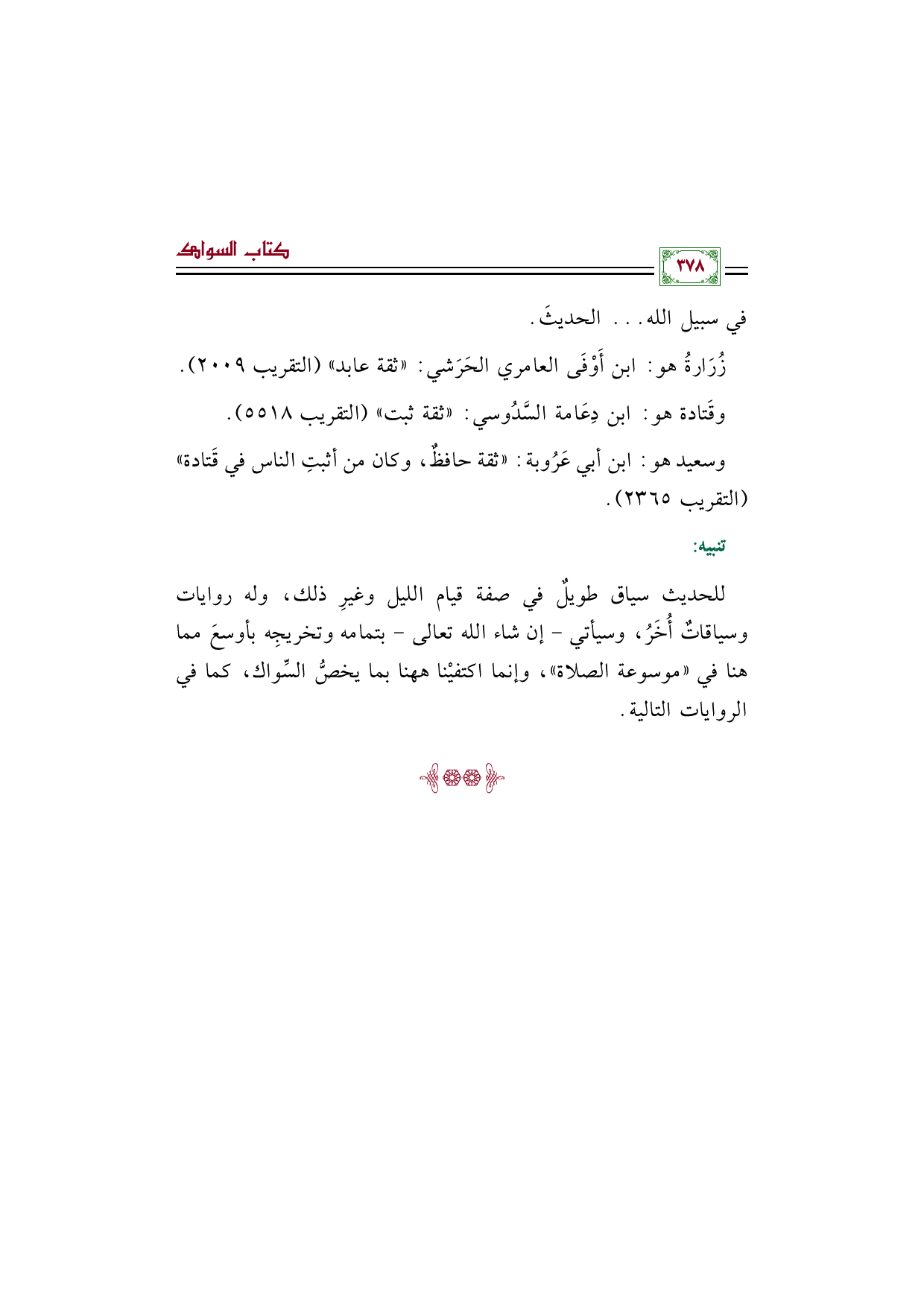 للحديث سياق طويلٌ في صفة قيام الليل وغيرِ ذلك، وله روايات وسياقاتٌ أُخَرُ، وسيأتي- إن شاء الله تعالى- بتمامه وتخريجِه بأوسعَ مما هنا في "موسوعة الصلاة"، وإنما اكتفيْنا ههنا بما يخصُّ السِّواك، كما في الروايات التالية.
