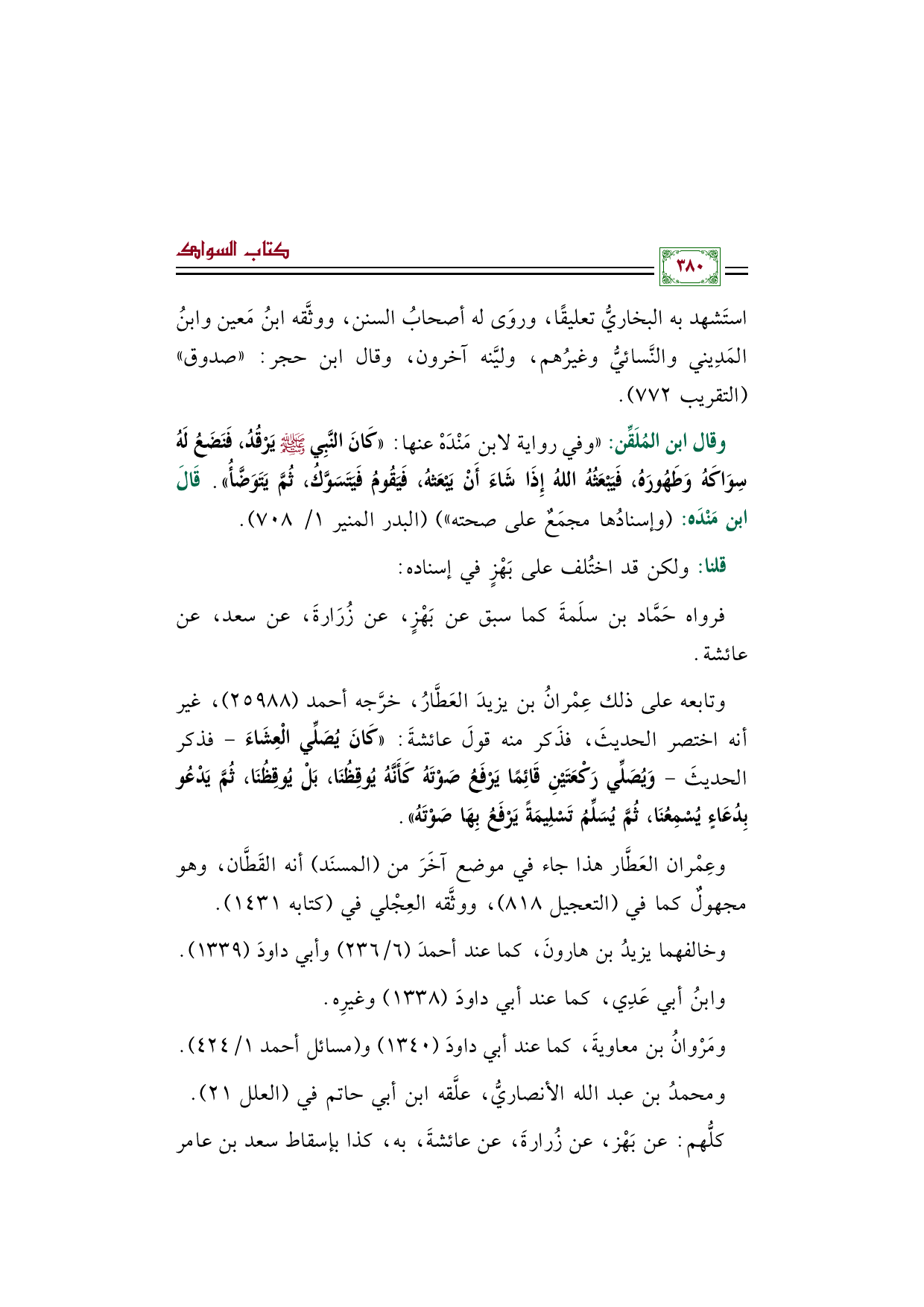 وقال ابن المُلَقِّن: "وفي رواية لابن مَنْدَهْ عنها: ((كَانَ النَّبِي صَلَّى اللهُ عَلَيْهِ وَسَلَّمَ يَرْقُدُ، فَنَضَعُ لَهُ سِوَاكَهُ وَطَهُورَهُ، فَيَبْعَثُهُ اللهُ إِذَا شَاءَ أَنْ يَبْعَثهُ، فَيَقُومُ فَيَتَسَوَّكُ، ثُمَّ يَتَوَضَّأُ)). قَالَ ابن مَنْدَه: (وإسنادُها مجمَعٌ على صحته) " (البدر المنير ١/ ٧٠٨).