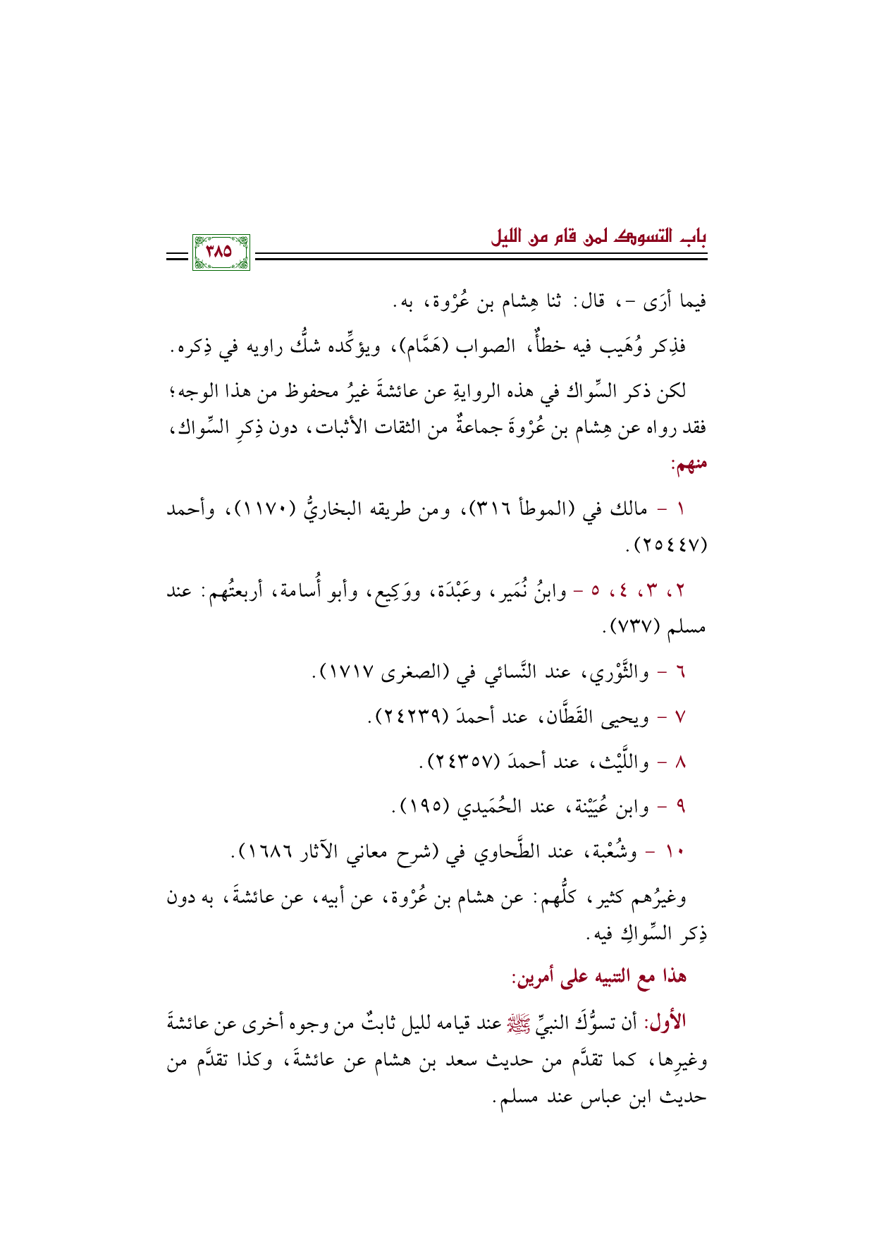 وغيرُهم كثير، كلُّهم: عن هشام بن عُرْوة، عن أبيه، عن عائشةَ، به دون ذِكر السِّواكِ فيه.