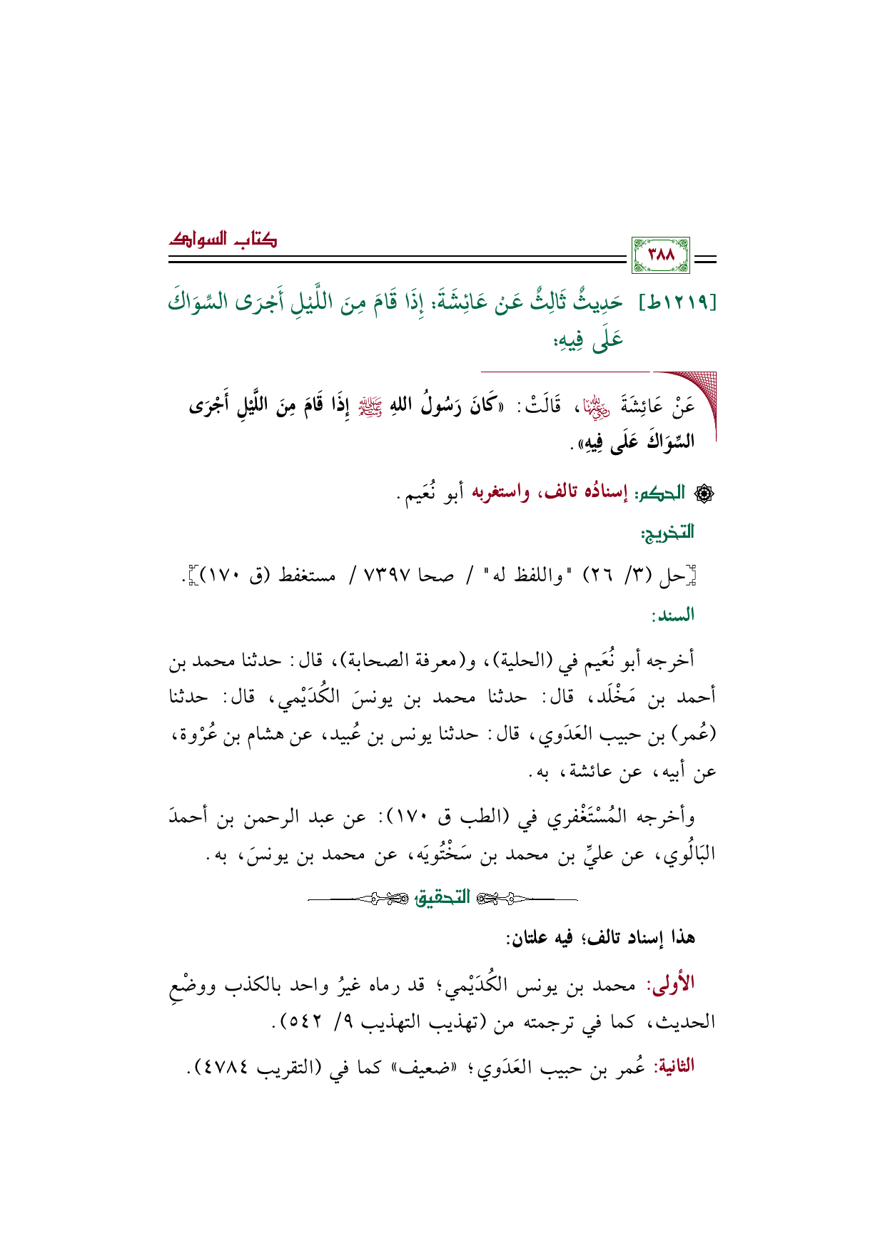 أخرجه أبو نُعَيم في (الحلية)، و (معرفة الصحابة)، قال: حدثنا محمد بن أحمد بن مَخْلَد، قال: حدثنا محمد بن يونسَ الكُدَيْمي، قال: حدثنا (عُمر) بن حبيب العَدَوي، قال: حدثنا يونس بن عُبيد، عن هشام بن عُرْوة، عن أبيه، عن عائشة، به.