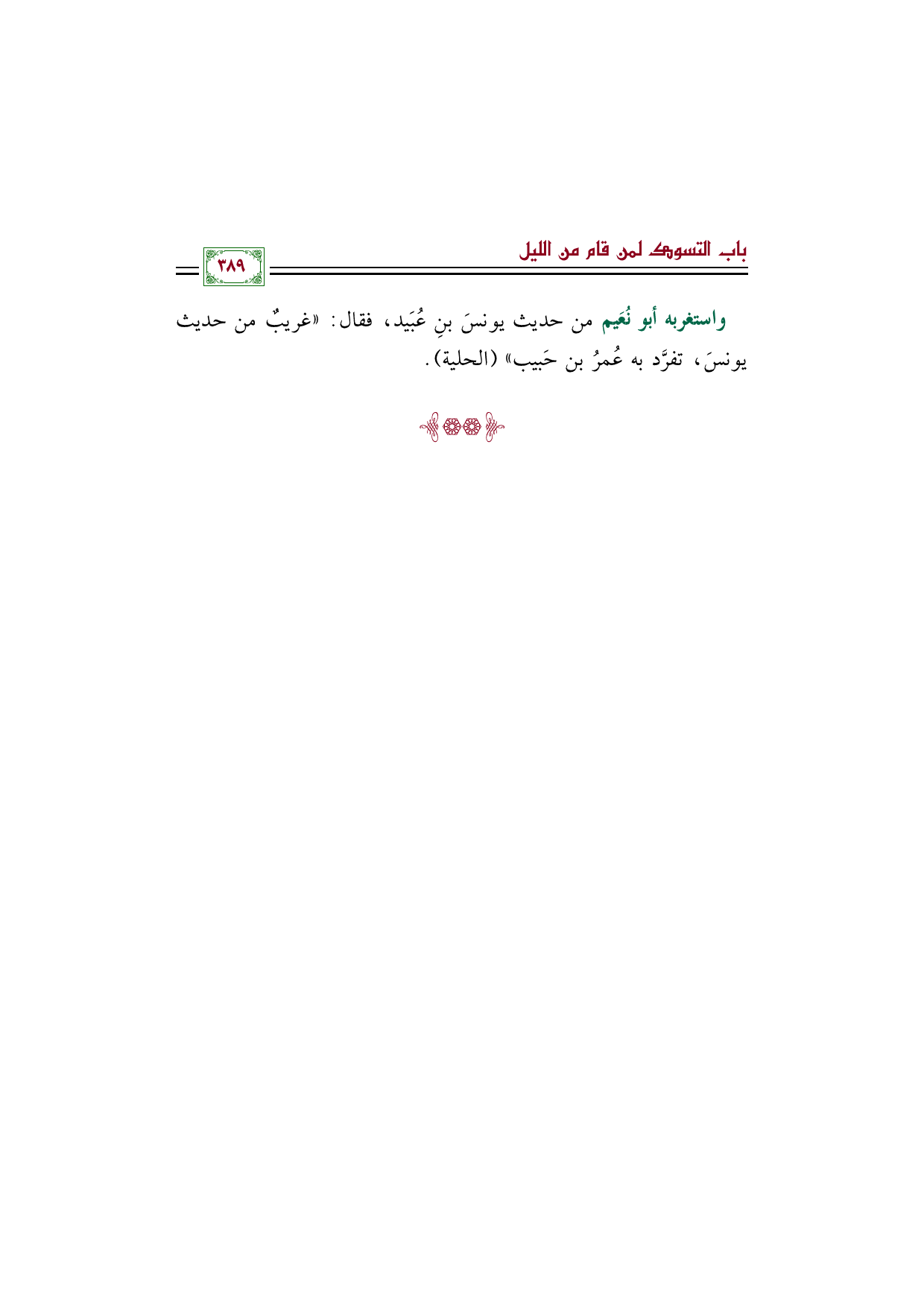 واستغربه أبو نُعَيم من حديث يونسَ بنِ عُبَيد، فقال: "غريبٌ من حديث يونسَ، تفرَّد به عُمرُ بن حَبيب" (الحلية).