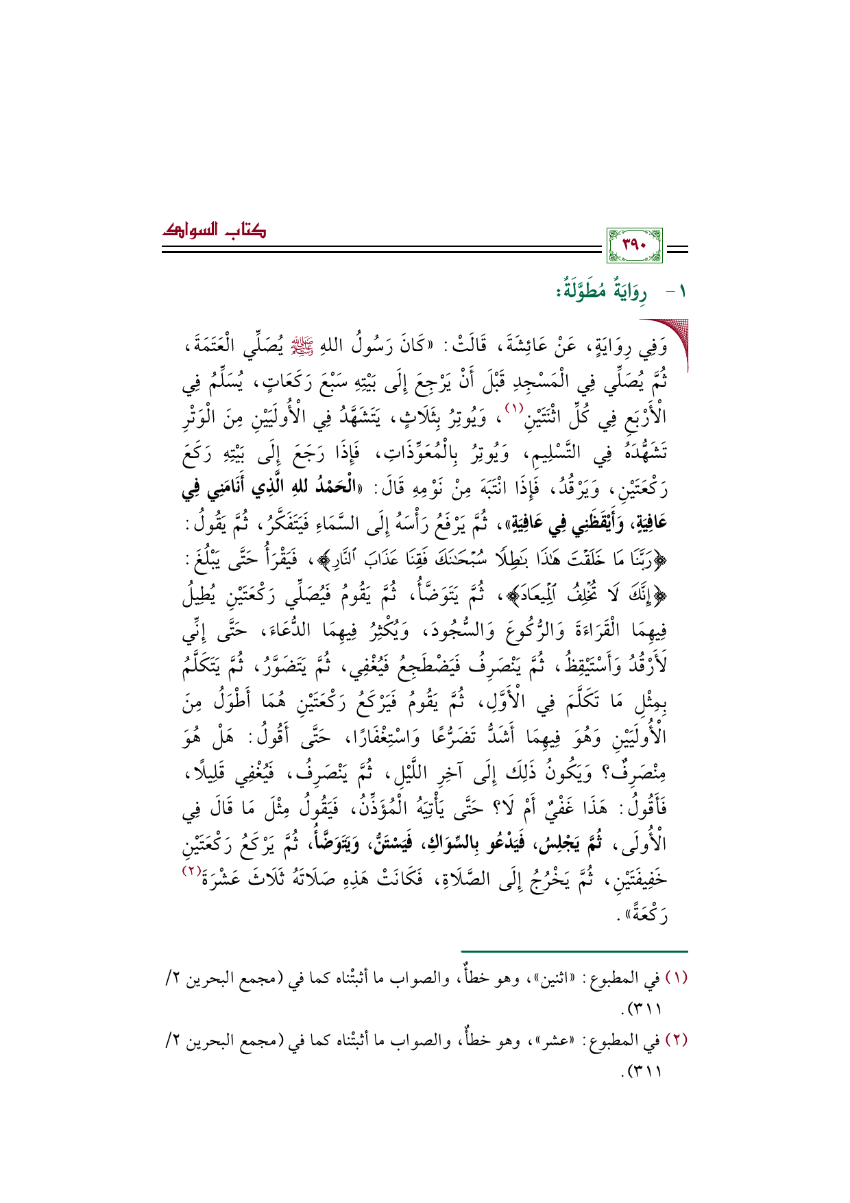 • وَفِي رِوَايَةٍ، عَنْ عَائِشَةَ، قَالَتْ: ((كَانَ رَسُولُ اللهِ صَلَّى اللهُ عَلَيْهِ وَسَلَّمَ يُصَلِّي الْعَتَمَةَ، ثُمَّ يُصَلِّي فِي الْمَسْجِدِ قَبْلَ أَنْ يَرْجِعَ إِلَى بَيْتِهِ سَبْعَ رَكَعَاتٍ، يُسَلِّمُ فِي الْأَرْبَعِ فِي كُلِّ اثْنَتَيْنِ (¬١)،