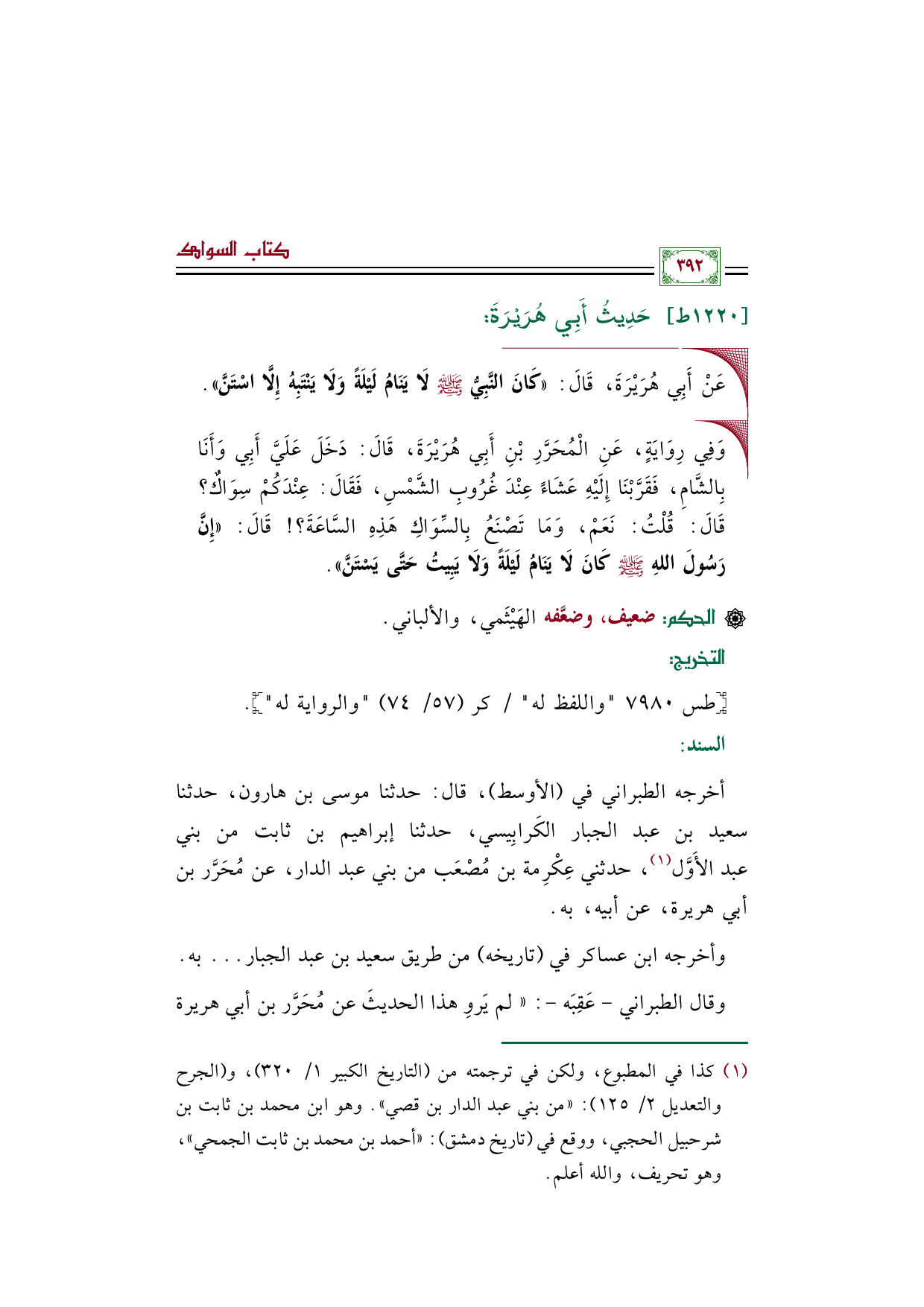 أخرجه الطبراني في (الأوسط)، قال: حدثنا موسى بن هارون، حدثنا سعيد بن عبد الجبار الكَرابِيسي، حدثنا إبراهيم بن ثابت من بني عبد الأَوَّل (¬١)، حدثني عِكْرِمة بن مُصْعَب من بني عبد الدار، عن مُحَرَّر بن أبي هريرة، عن أبيه، به.