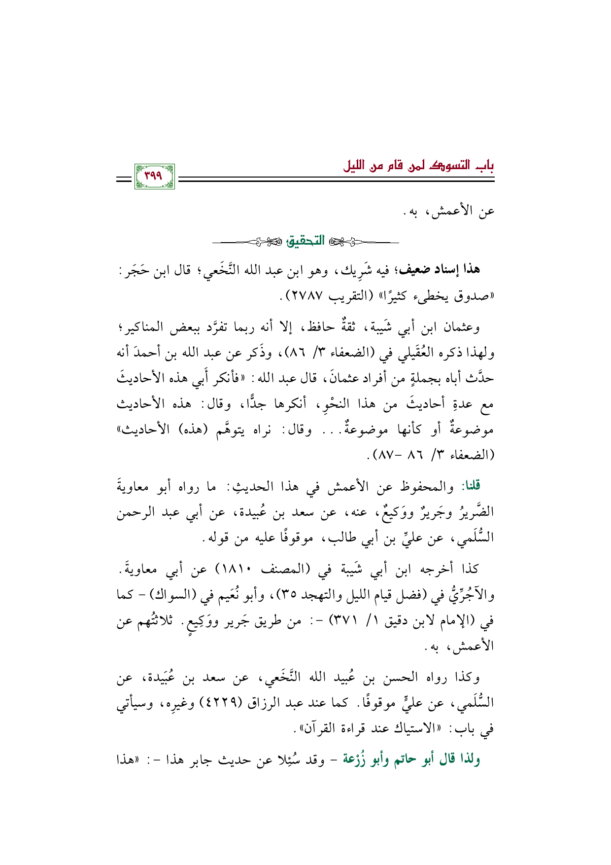 كذا أخرجه ابن أبي شَيبة في (المصنف ١٨١٠) عن أبي معاويةَ. والآجُرِّيُّ في (فضل قيام الليل والتهجد ٣٥)، وأبو نُعَيم في "السواك"- كما في (الإمام لابن دقيق ١/ ٣٧١) -: من طريق جَرير ووَكِيعٍ. ثلاثتُهم عن الأعمش، به.