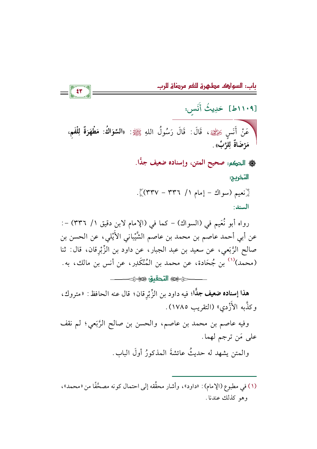 رواه أبو نُعَيم في "السواك"- كما في (الإمام لابن دقيق ١/ ٣٣٦) -: عن أبي أحمد عاصم بن محمد بن عاصم الشَّيْباني الأَيْلي، عن الحسن بن صالح الرَّبَعي، عن سعيد بن عبد الجبار، عن داود بن الزِّبْرِقان، قال: ثنا (محمد) (¬١) بن جُحَادة، عن محمد بن المُنْكَدِر، عن أنس بن مالك، به.
