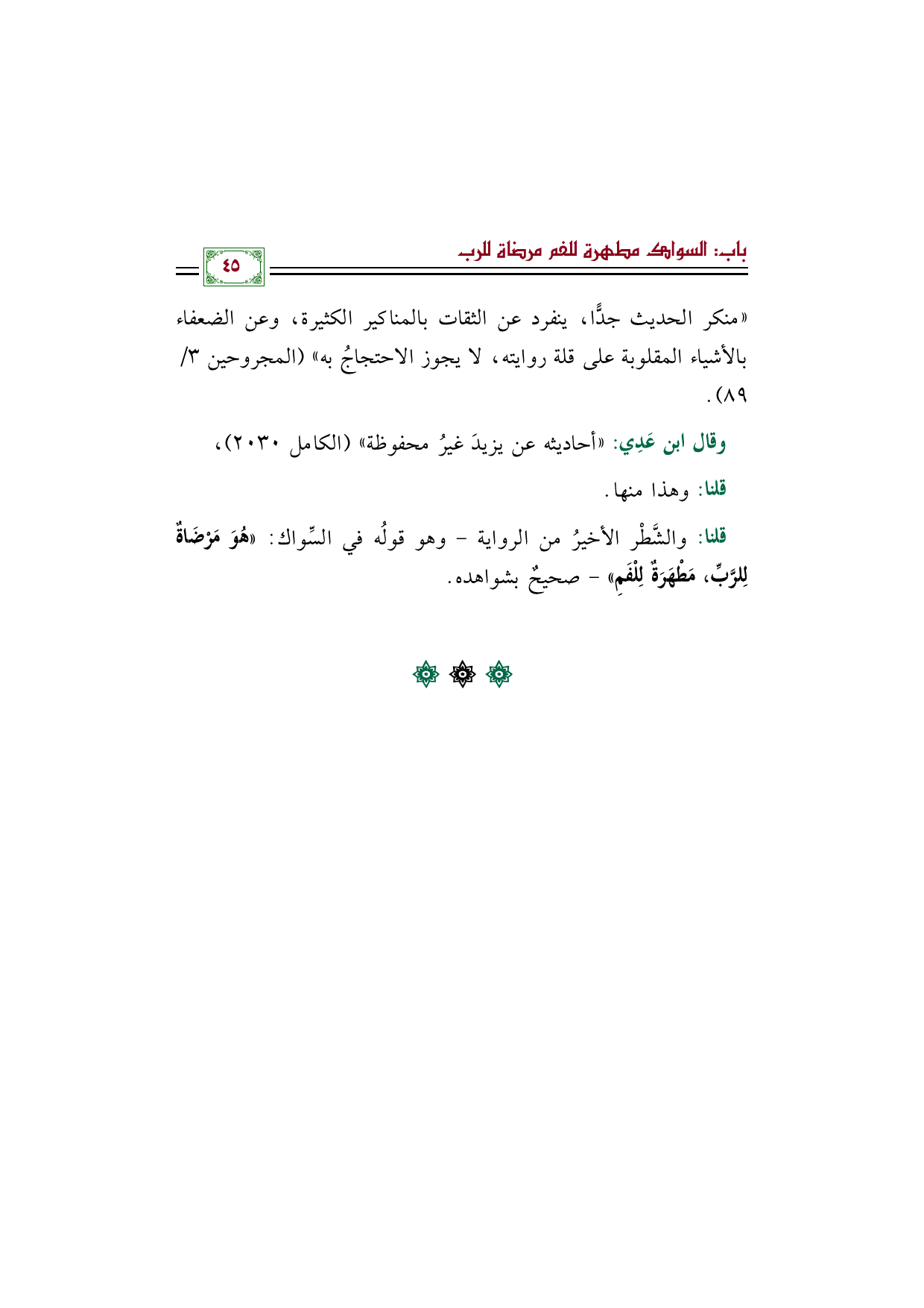قلنا: والشَّطْر الأخيرُ من الرواية- وهو قولُه في السِّواك: ((هُوَ مَرْضَاةٌ لِلرَّبِّ، مَطْهَرَةٌ لِلْفَمِ)) - صحيحٌ بشواهده.