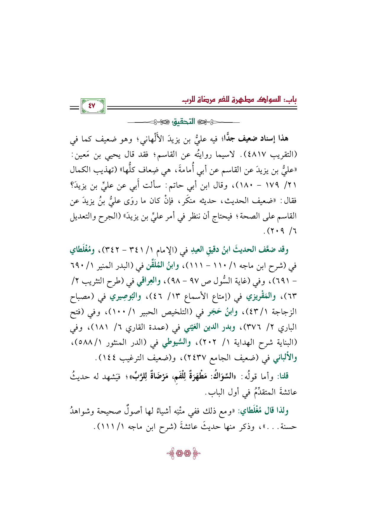 قلنا: وأما قولُه: "السِّوَاكُ: مَطْهَرَةٌ لِلْفَمِ، مَرْضَاةٌ لِلرَّبِّ"؛ فيَشهد له حديثُ عائشةَ المتقدِّمُ في أول الباب.