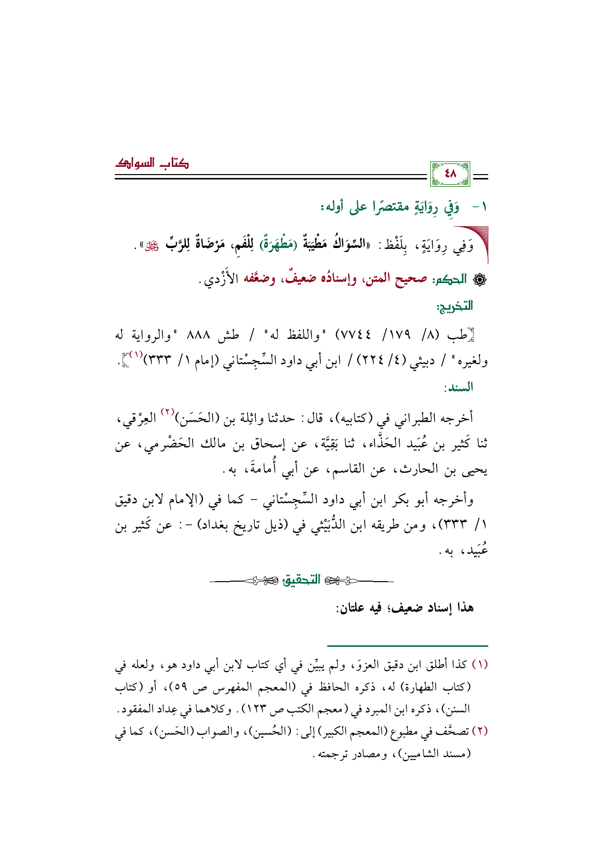 (¬١) كذا أطلق ابن دقيق العزوَ، ولم يبيِّن في أي كتاب لابن أبي داود هو، ولعله في "كتاب الطهارة" له، ذكره الحافظ في (المعجم المفهرس ص ٥٩)، أو "كتاب السنن"، ذكره ابن المبرد في (معجم الكتب ص ١٢٣). وكلاهما في عِداد المفقود.