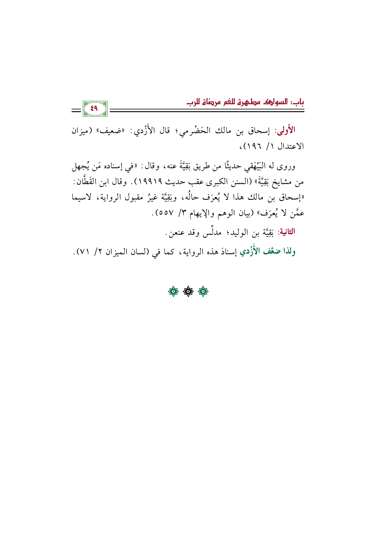 الأولى: إسحاق بن مالك الحَضْرمي؛ قال الأَزْدي: "ضعيف" (ميزان الاعتدال ١/ ١٩٦)،