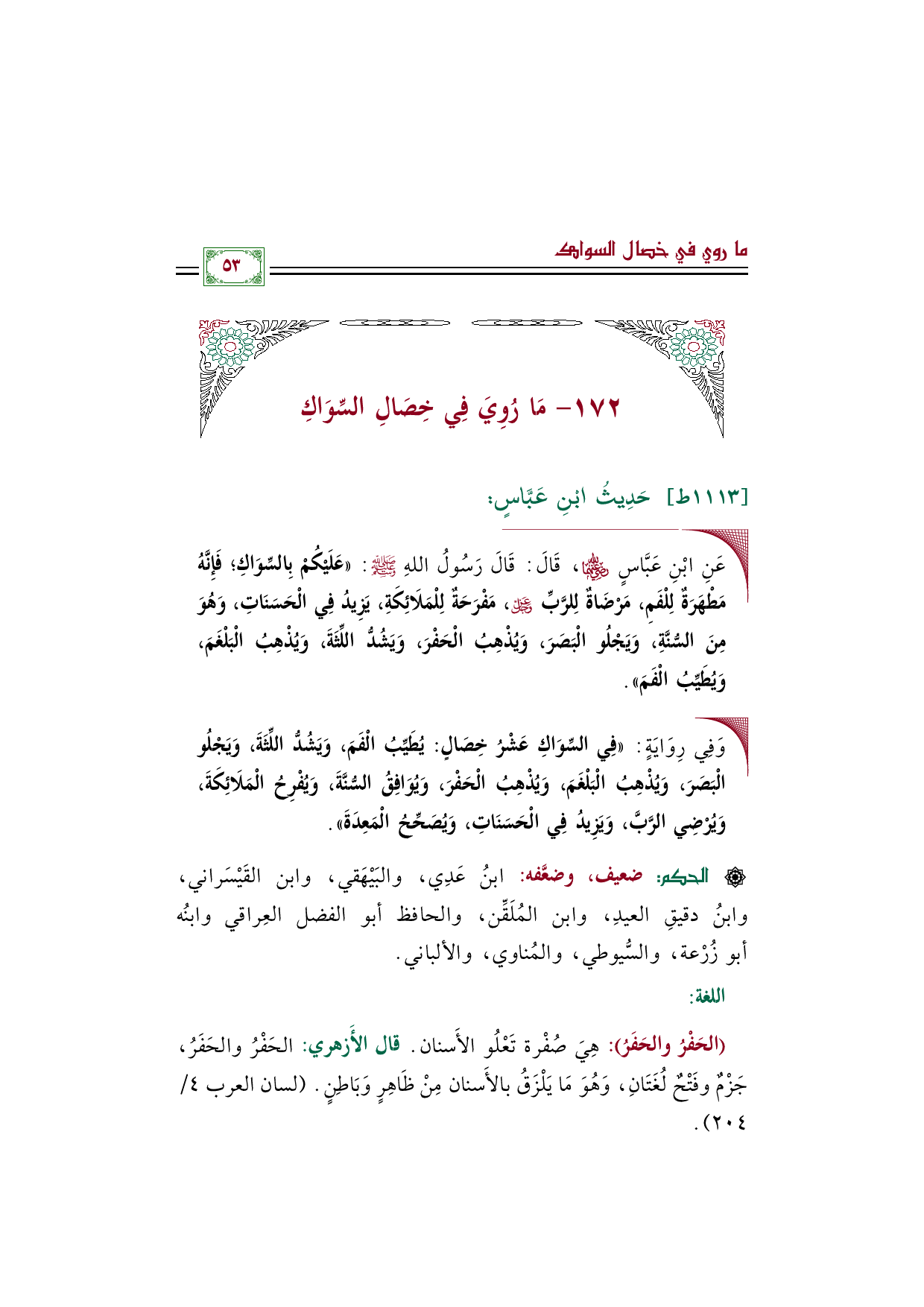 ◼ عَنِ ابْنِ عَبَّاسٍ رَضِيَ اللهُ عَنْهُمَا، قَالَ: قَالَ رَسُولُ اللهِ صَلَّى اللهُ عَلَيْهِ وَسَلَّمَ: ((عَلَيْكُمْ بِالسِّوَاكِ؛ فَإِنَّهُ مَطْهَرَةٌ لِلْفَمِ، مَرْضَاةٌ لِلرَّبِّ عَزَّ وَجَلَّ، مَفْرَحَةٌ لِلْمَلَائِكَةِ، يَزِيدُ فِي الْحَسَنَاتِ، وَهُوَ مِنَ السُّنَّةِ، وَيَجْلُو الْبَصَرَ، وَيُذْهِبُ الْحَفْرَ، وَيَشُدُّ اللِّثَةَ، وَيُذْهِبُ الْبَلْغَمَ، وَيُطَيِّبُ الْفَمَ)).
