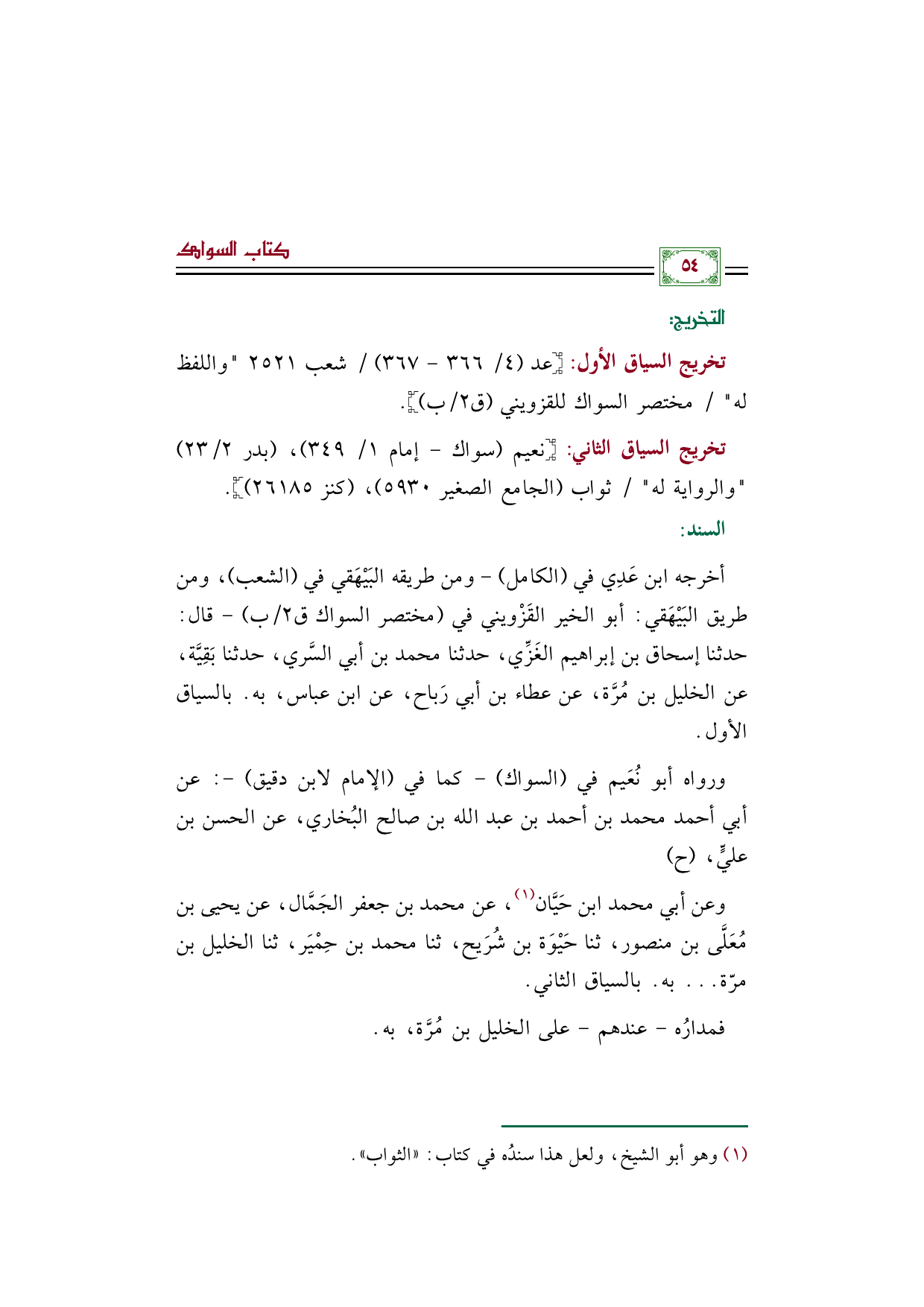 أخرجه ابن عَدِي في (الكامل) - ومن طريقه البَيْهَقي في (الشعب)، ومن طريق البَيْهَقي: أبو الخير القَزْويني في (مختصر السواك ق ٢/ب) - قال: حدثنا إسحاق بن إبراهيم الغَزِّي، حدثنا محمد بن أبي السَّري، حدثنا بَقِيَّة، عن الخليل بن مُرَّة، عن عطاء بن أبي رَباح، عن ابن عباس، به. بالسياق الأول.