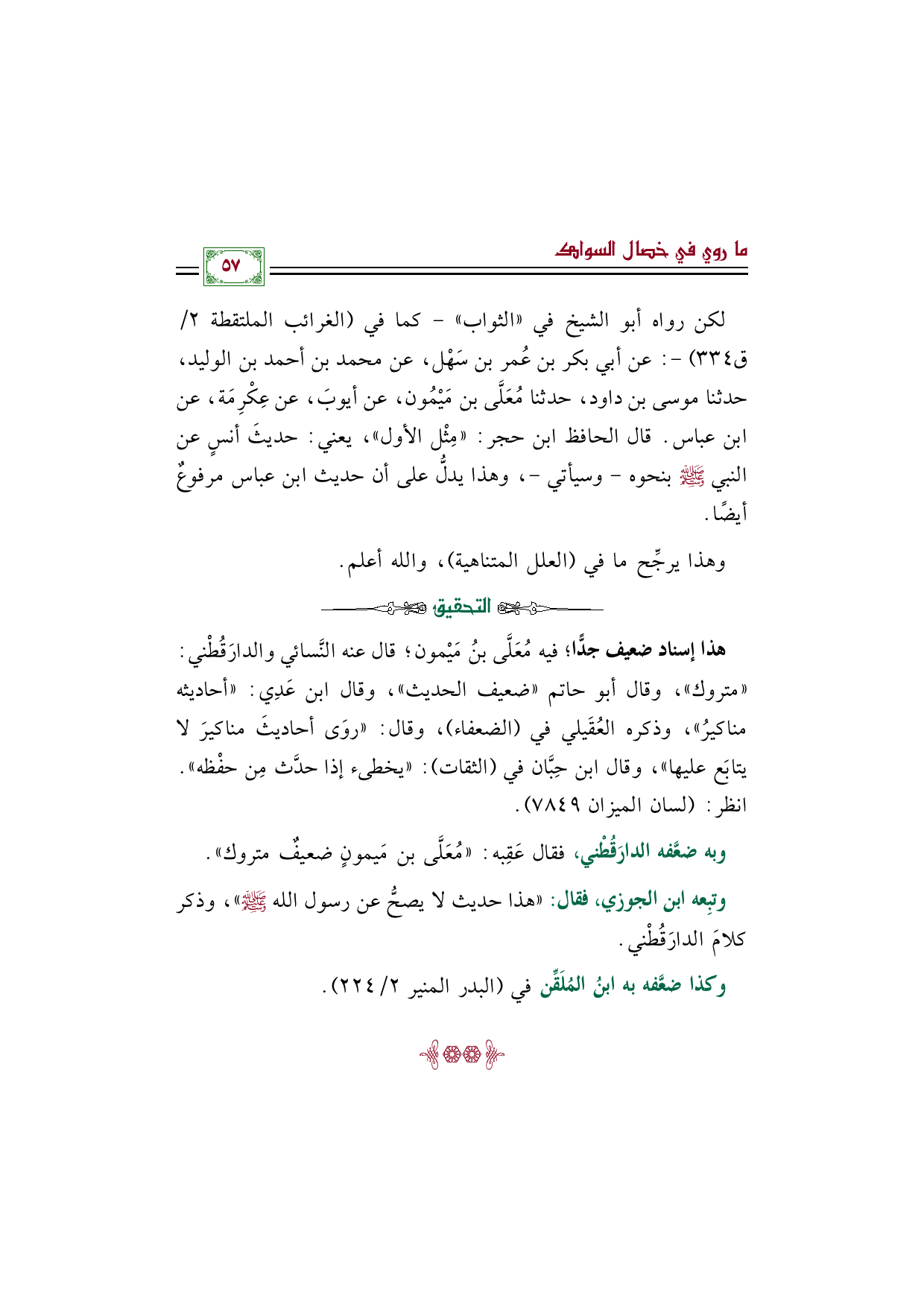 وبه ضعَّفه الدارَقُطْني، فقال عَقِبه: "مُعَلَّى بن مَيمونٍ ضعيفٌ متروك".