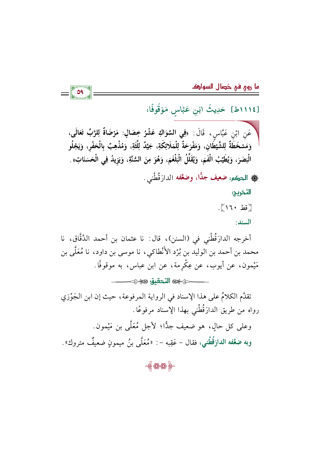 أخرجه الدارَقُطْني في (السنن)، قال: نا عثمان بن أحمد الدَّقَّاق, نا محمد بن أحمد بن الوليد بن بُرْد الأَنْطاكي, نا موسى بن داود, نا مُعَلَّى بن مَيْمون, عن أيوب, عن عِكْرِمة, عن ابن عباس، به موقوفًا.