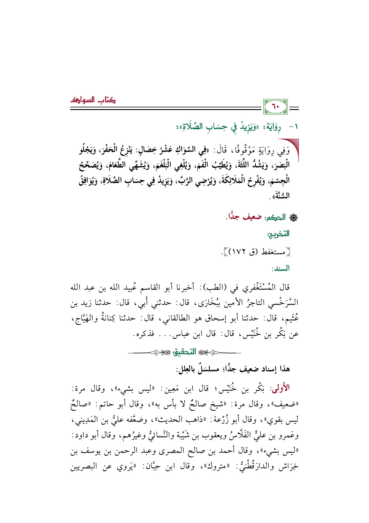 قال المُسْتَغْفري في (الطب): أخبرنا أبو القاسم عُبيد الله بن عبد الله السَّرَخْسي التاجرُ الأمين ببُخَارَى، قال: حدثني أَبي، قال: حدثنا زيد بن عُثَيم، قال: حدثنا أبو إسحاق هو الطالقاني، قال: حدثنا كِنانةُ والهَيَّاج، عن بَكْر بن خُنَيْس، قال: قال ابن عباس ... فذكره.