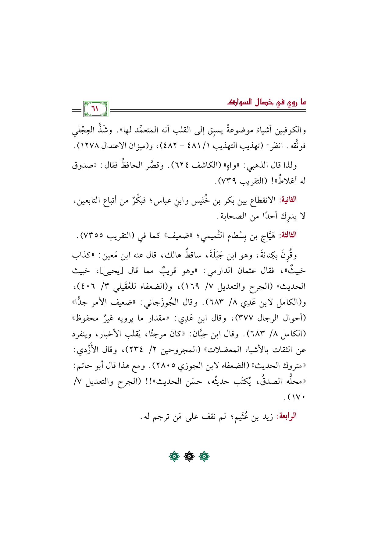 الثالثة: هَيَّاج بن بِسْطام التَّميمي؛ "ضعيف" كما في (التقريب ٧٣٥٥).